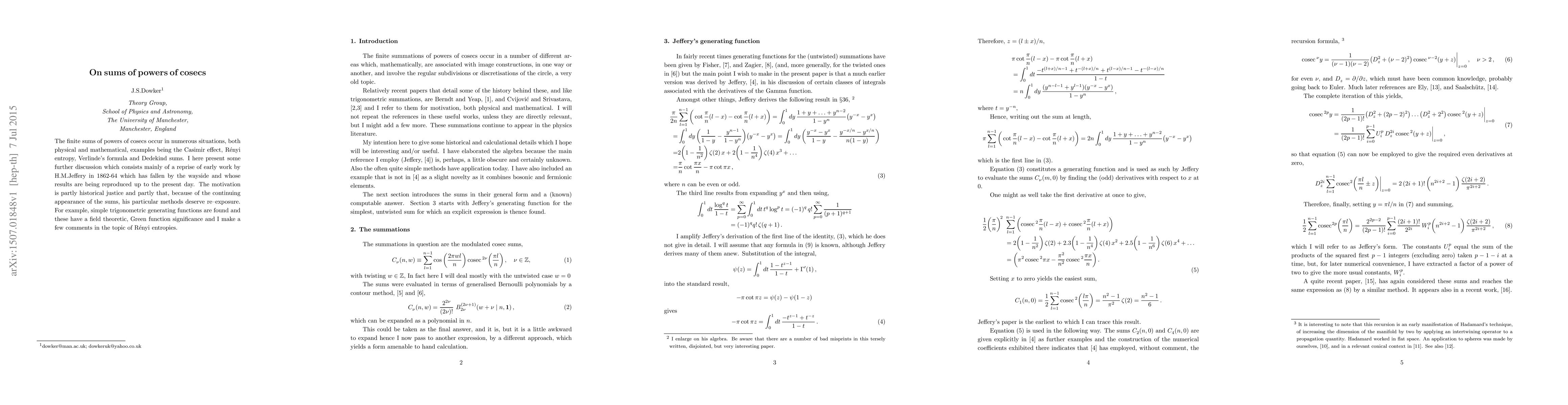 The finite sums of powers of cosecs occur in numerous situations, both physical and mathematical, examples being the Casimir effect, Renyi entropy, Verlinde's formula and Dedekind sums. I here present some further discussion which consists mainly of a reprise of early work by H.M.Jeffery in 1862-64 which has fallen by the wayside and whose results are being reproduced up to the present day. The motivation is partly historical justice and partly that, because of the continuing appearance of the sums, his particular methods deserve re--exposure. For example, simple trigonometric generating functions are found and these have a field theoretic, Green function significance and I make a few comments in the topic of R\'enyi entropies.