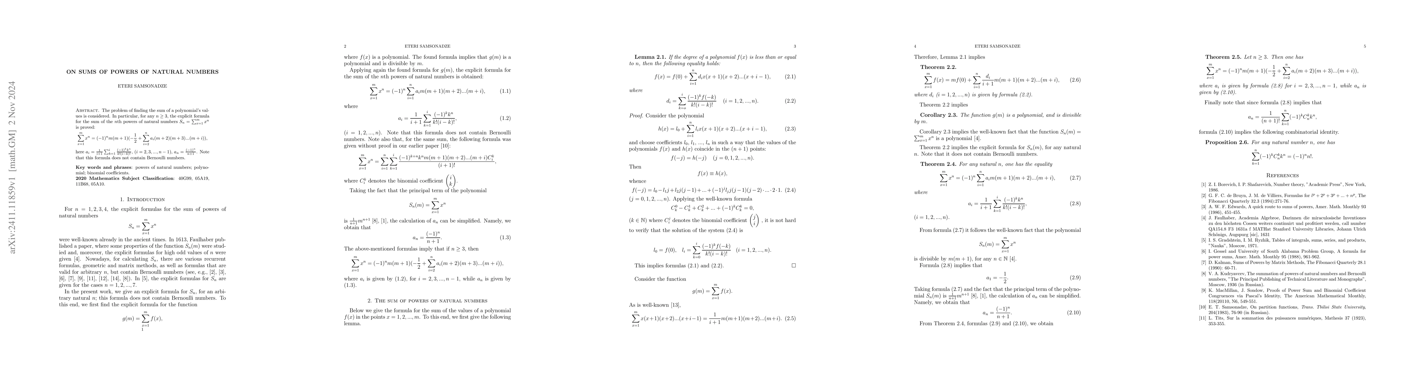This paper derives an explicit formula for the sum of the $n$th powers of natural numbers $S_n=\sum_{x=1}^{m}x^{n}$, providing a novel expression that avoids Bernoulli numbers. The formula involves terms dependent on $m$ and coefficients $a_i$ that simplify the polynomial sum.