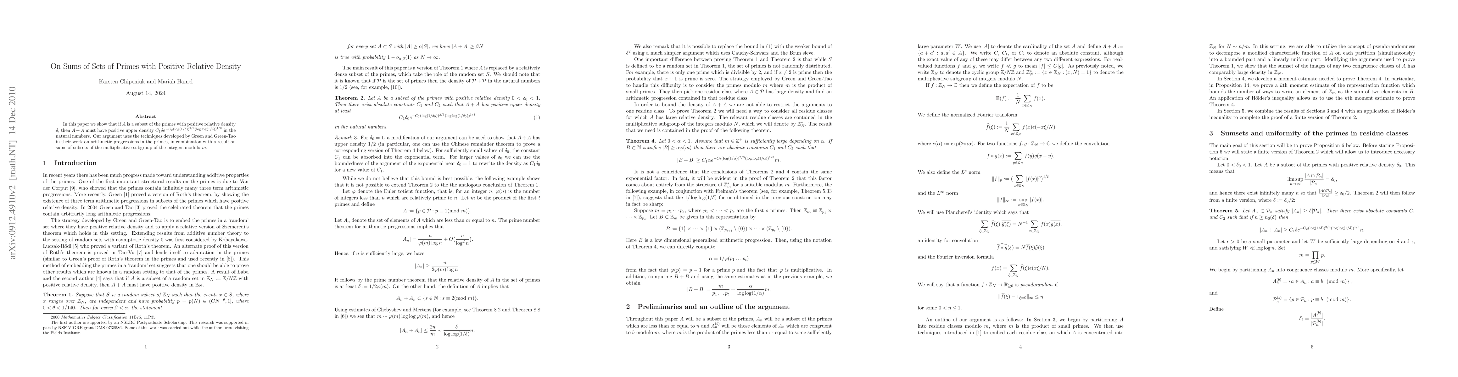Researchers show that a set of primes with positive relative density will produce a sum with positive upper density when combined with itself. The density bound is given as $C_1 heta e^{-C_2(rac{ ext{log}(1/ heta)}{ ext{log} ext{log}(1/ heta)})^{2/3}}$.