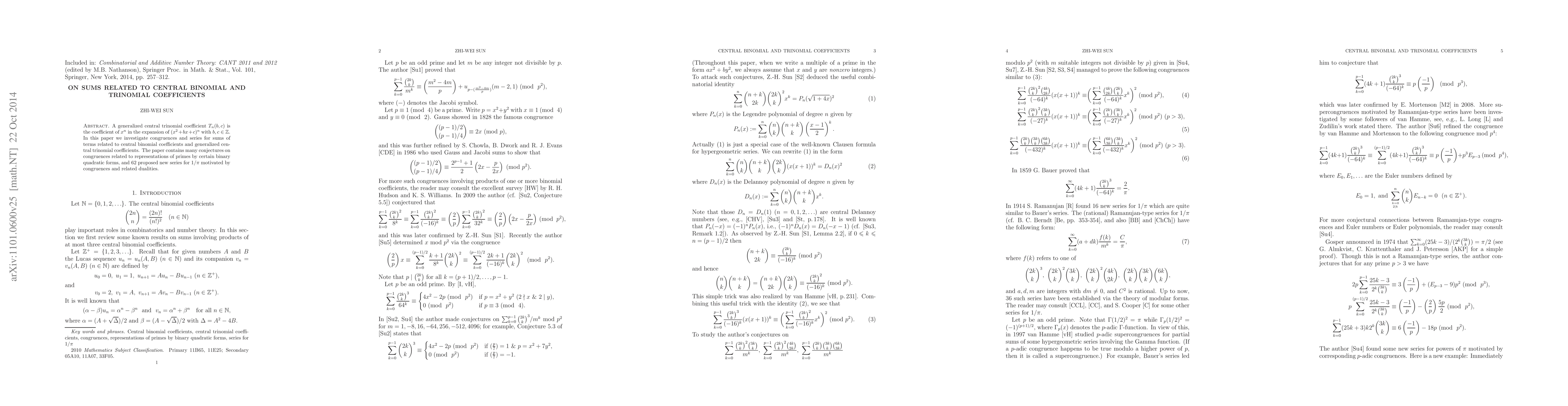 This paper explores generalized central trinomial coefficients and their connections to central binomial coefficients, focusing on congruences and series representations. It proposes numerous conjectures on prime representations and introduces 62 new series for $1/\pi$ based on these findings.