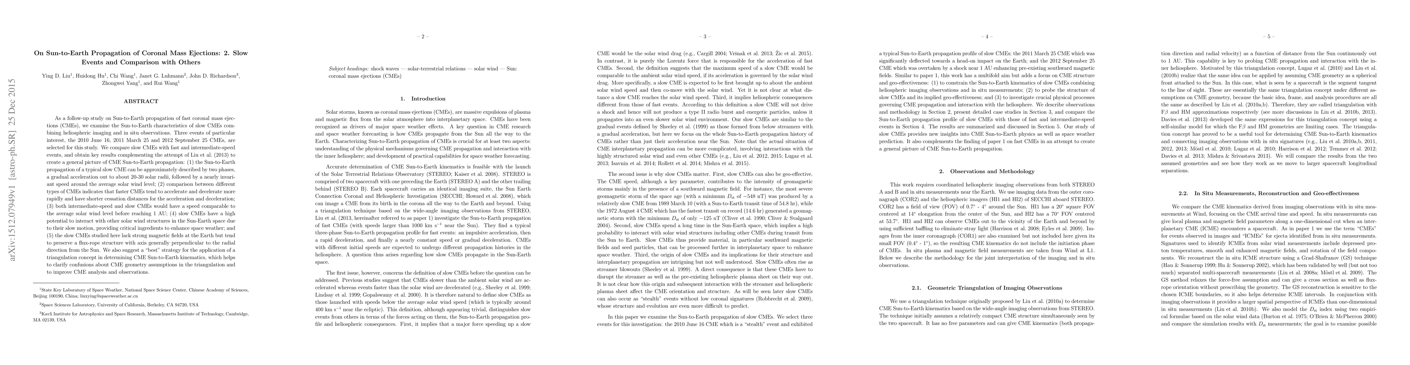 This study investigates the Sun-to-Earth propagation of slow coronal mass ejections (CMEs) compared to fast and intermediate-speed events, revealing that slow CMEs typically accelerate gradually before maintaining a nearly constant speed, and have a high potential to interact with other solar wind structures.