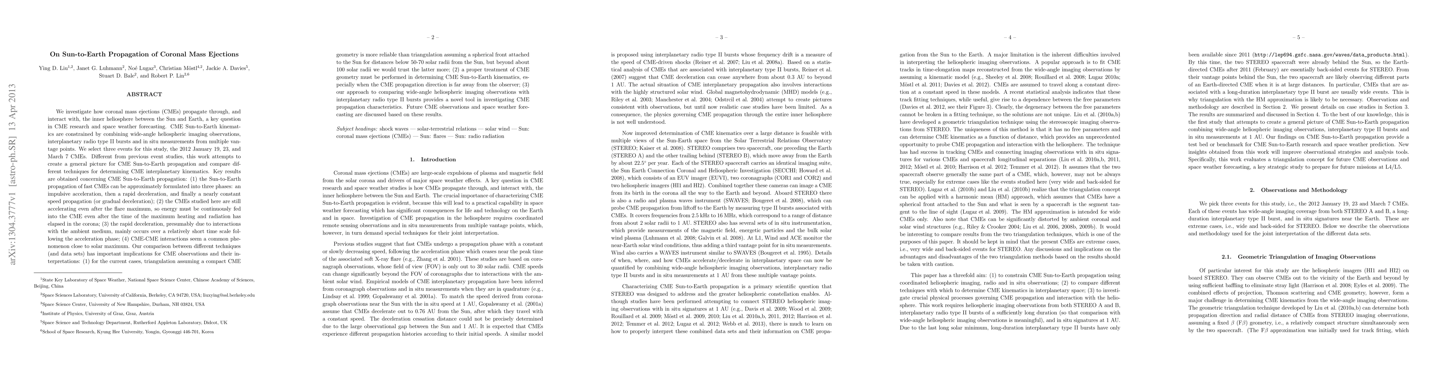 This paper examines the propagation and interaction of coronal mass ejections (CMEs) from the Sun to Earth, analyzing three specific events from 2012. It combines various observational techniques to derive CME kinematics and discusses implications for future space weather forecasting and CME observation methods.