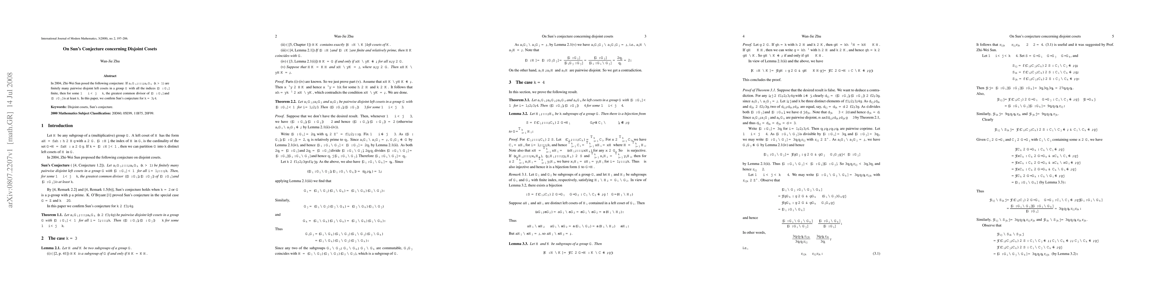 This paper confirms Sun's conjecture for the cases when k equals 3 and 4, demonstrating that for finitely many pairwise disjoint left cosets in a group G, the greatest common divisor of the indices is at least k for some pair of cosets.