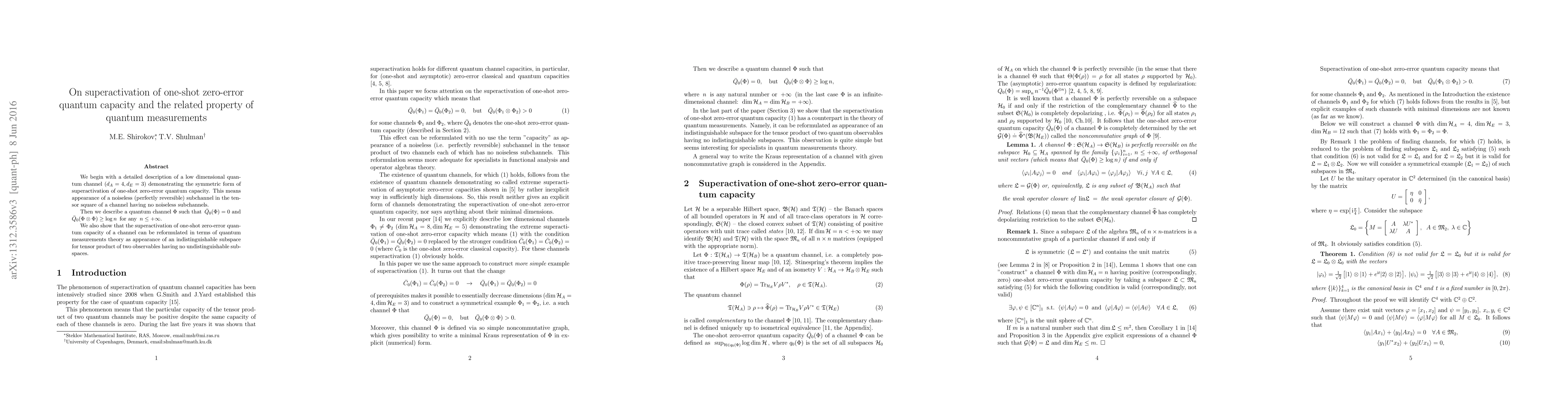 We begin with a detailed description of a low dimensional quantum channel ($d_A=4, d_E=3$) demonstrating the symmetric form of superactivation of one-shot zero-error quantum capacity. This means appearance of a noiseless (perfectly reversible) subchannel in the tensor square of a channel having no noiseless subchannels. Then we describe a quantum channel $\Phi$ such that $\,\bar{Q}_0(\Phi)=0$ and $\,\bar{Q}_0(\Phi\otimes\Phi)\geq\log n\,$ for any $\,n\leq+\infty$. We also show that the superactivation of one-shot zero-error quantum capacity of a channel can be reformulated in terms of quantum measurements theory as appearance of an indistinguishable subspace for tensor product of two observables having no indistinguishable subspaces.