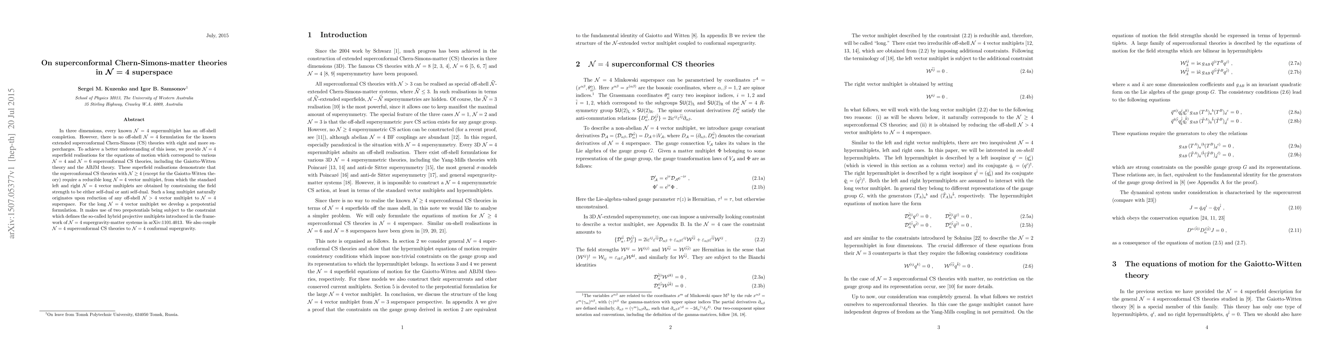 In three dimensions, every known N=4 supermultiplet has an off-shell completion. However, there is no off-shell N=4 formulation for the known extended superconformal Chern-Simons (CS) theories with eight and more supercharges. To achieve a better understanding of this issue, we provide N=4 superfield realisations for the equations of motion which correspond to various N=4 and N=6 superconformal CS theories, including the Gaiotto-Witten theory and the ABJM theory. These superfield realisations demonstrate that the superconformal CS theories with N>3 (except for the Gaiotto-Witten theory) require a reducible long N=4 vector multiplet, from which the standard left and right N=4 vector multiplets are obtained by constraining the field strength to be either self-dual or anti self-dual. Such a long multiplet naturally originates upon reduction of any off-shell N>4 vector multiplet to N=4 superspace. For the long N=4 vector multiplet we develop a prepotential formulation. It makes use of two prepotentials being subject to the constraint which defines the so-called hybrid projective multiplets introduced in the framework of N=4 supergravity-matter systems in arXiv:1101.4013. We also couple N=4 superconformal CS theories to N=4 conformal supergravity.