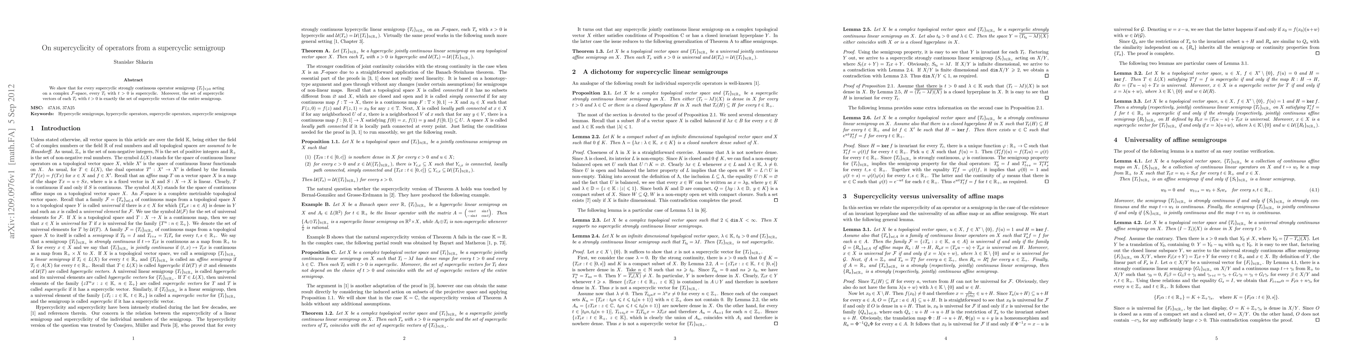 This paper demonstrates that any supercyclic strongly continuous operator semigroup ${T_t}_{t\geq 0}$ acting on a complex $\F$-space exhibits supercyclicity for every $T_t$ with $t>0$, with all supercyclic vectors for individual $T_t$ coinciding with those of the entire semigroup.