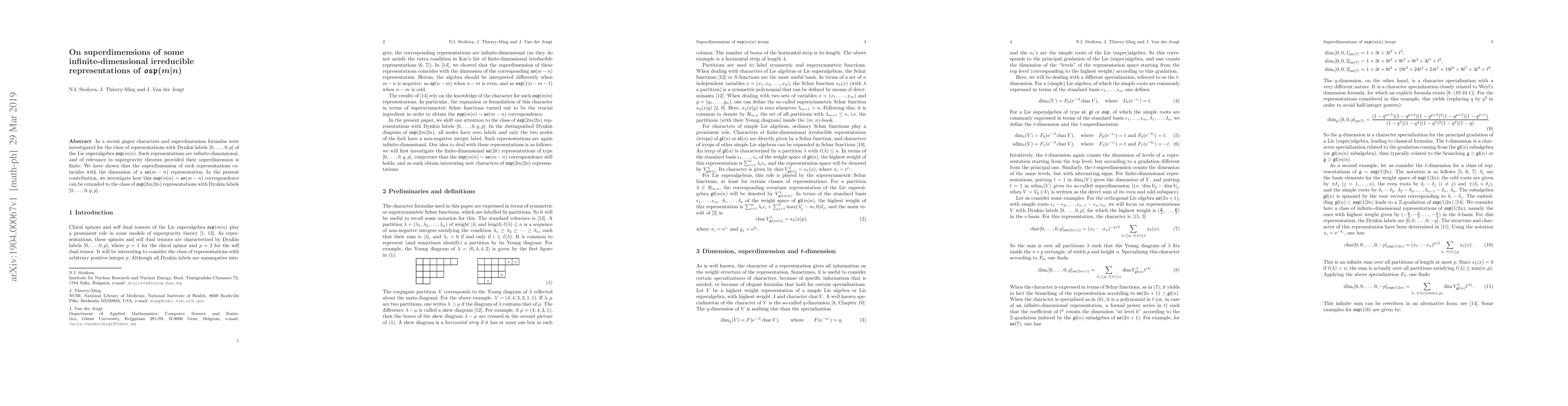 This paper investigates the superdimensions of infinite-dimensional irreducible representations of $osp(m|n)$, demonstrating that their superdimension equals the dimension of a $so(m-n)$ representation. The study extends this correspondence to $osp(2m|2n)$ representations with Dynkin labels $[0,\ldots,0,q,p]$.