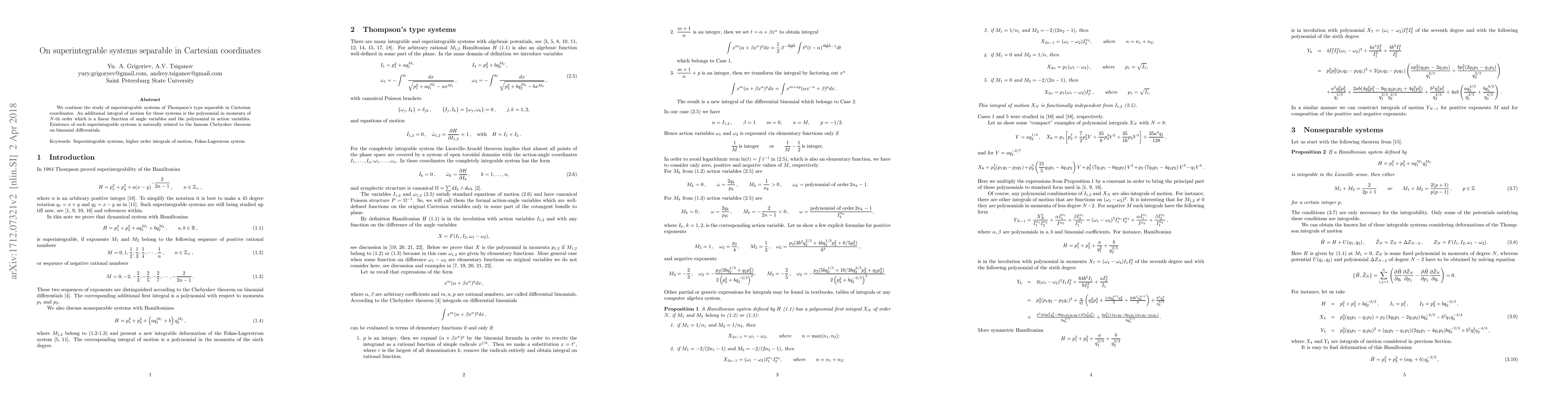 This paper explores superintegrable systems of Thompson's type separable in Cartesian coordinates, introducing an additional integral of motion. The existence of these systems is linked to Chebyshev's theorem on binomial differentials.