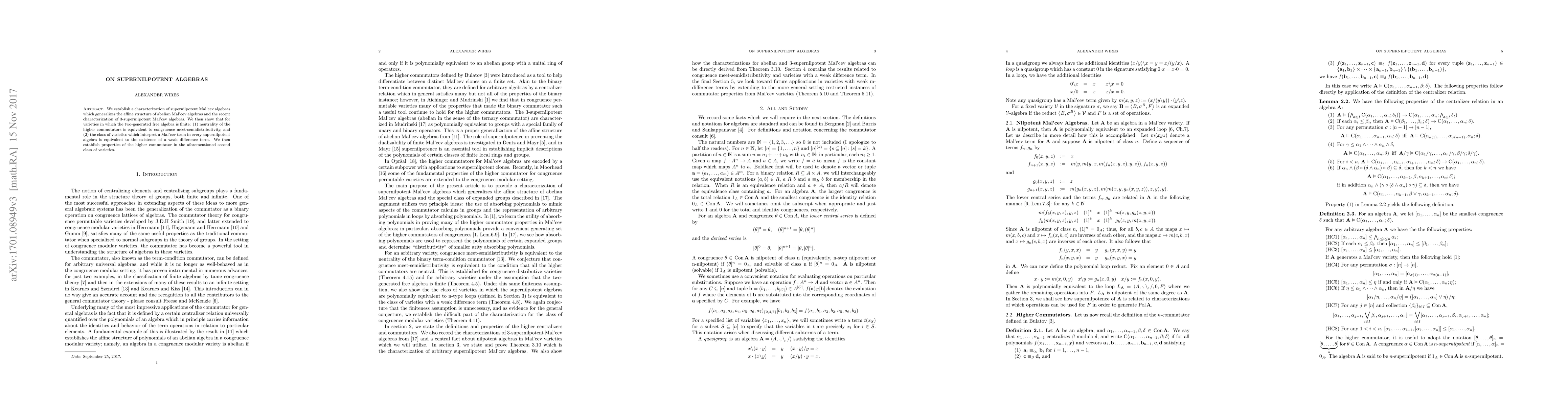 We establish a characterization of supernilpotent Mal'cev algebras which generalizes the affine structure of abelian Mal'cev algebras and the recent characterization of 3-supernilpotent Mal'cev algebras. We then show that for varieties in which the two-generated free algebra is finite: (1) neutrality of the higher commutators is equivalent to congruence meet-semidistributivity, and (2) the class of varieties which interpret a Mal'cev term in every supernilpotent algebra is equivalent to the existence of a weak difference term. We then establish properties of the higher commutator in the aforementioned second class of varieties.