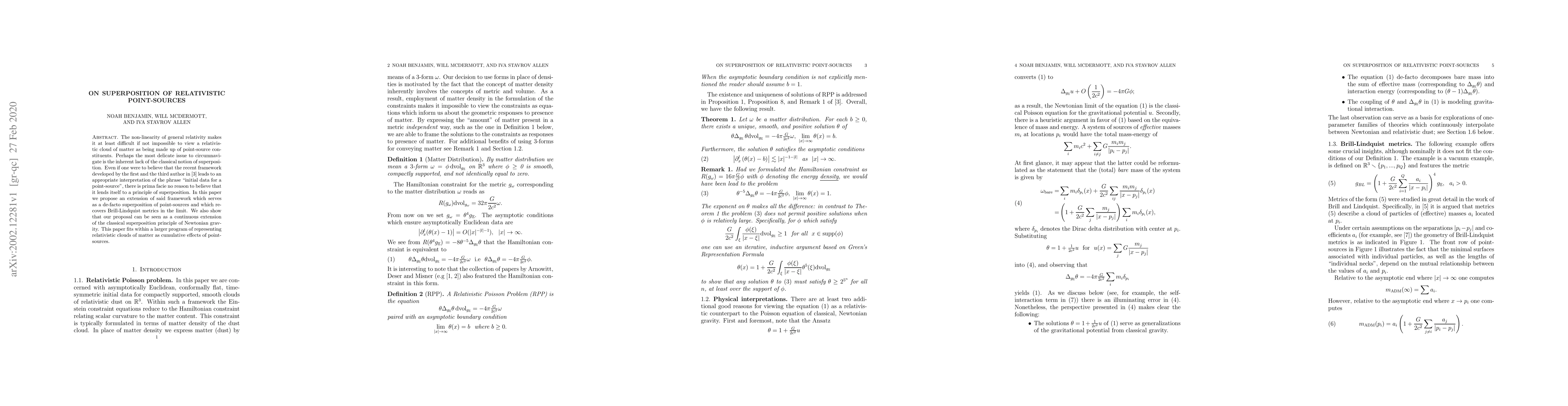 The non-linearity of general relativity makes it at least difficult if not impossible to view a relativistic cloud of matter as being made up of point-source constituents. Perhaps the most delicate issue to circumnavigate is the inherent lack of the classical notion of superposition. Even if one were to believe that the recent framework developed by the first and the third author leads to an appropriate interpretation of the phrase initial data for a point-source, there is prima facie no reason to believe that it lends itself to a principle of superposition. In this paper we propose an extension of said framework which serves as a de-facto superposition of point-sources and which recovers Brill-Lindquist metrics in the limit. We also show that our proposal can be seen as a continuous extension of the classical superposition principle of Newtonian gravity. This paper fits within a larger program of representing relativistic clouds of matter as cumulative effects of point-sources.