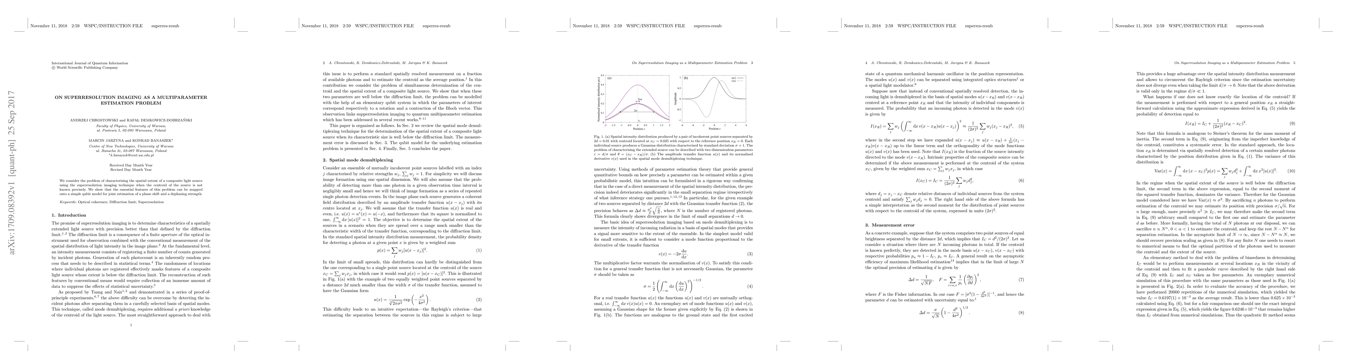 We consider the problem of characterising the spatial extent of a composite light source using the superresolution imaging technique when the centroid of the source is not known precisely. We show that the essential features of this problem can be mapped onto a simple qubit model for joint estimation of a phase shift and a dephasing strength.