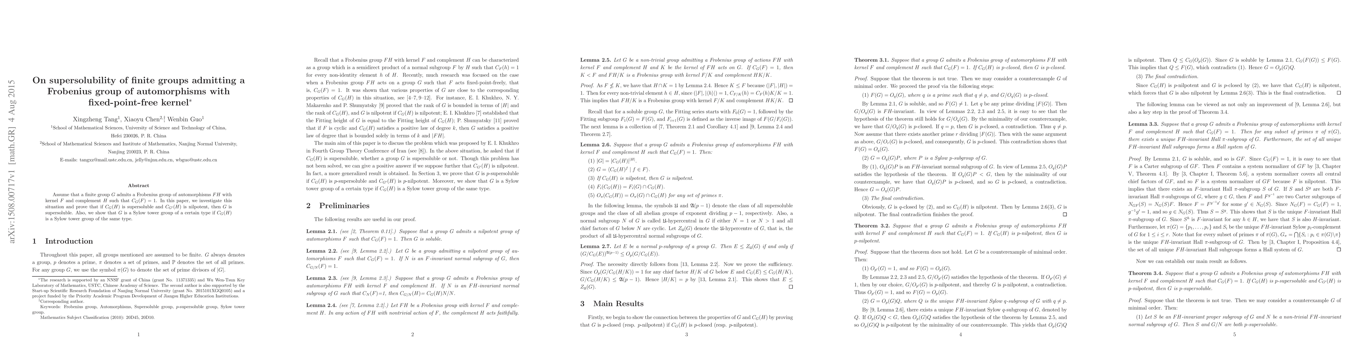 Assume that a finite group $G$ admits a Frobenius group of automorphisms $FH$ with kernel $F$ and complement $H$ such that $C_{G}(F)=1$. In this paper, we investigate this situation and prove that if $C_G(H)$ is supersoluble and $C_{G'}(H)$ is nilpotent, then $G$ is supersoluble. Also, we show that $G$ is a Sylow tower group of a certain type if $C_{G}(H)$ is a Sylow tower group of the same type.