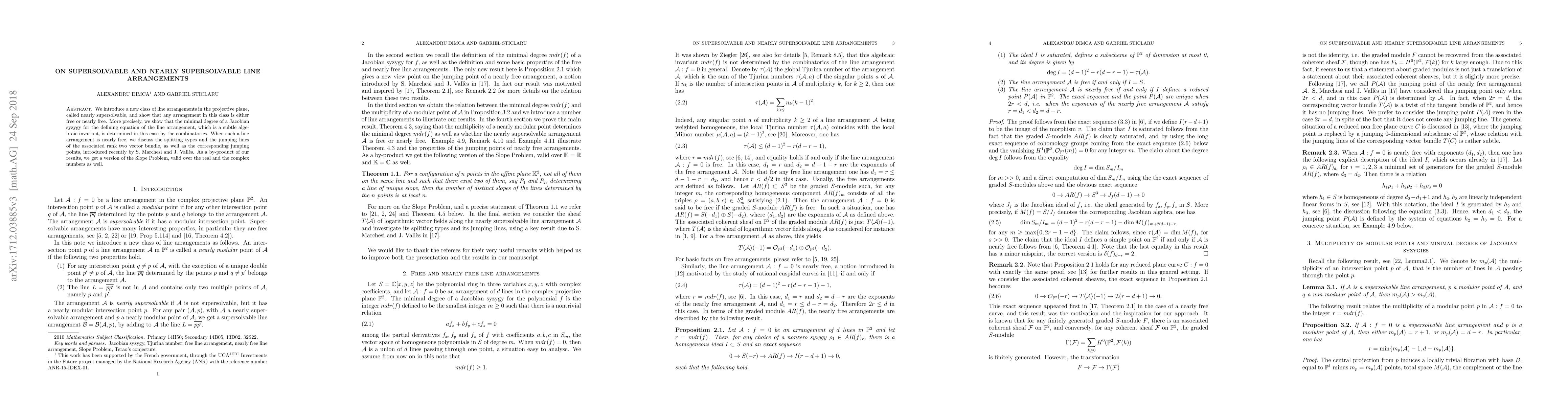 This paper introduces "nearly supersolvable" line arrangements in the projective plane, proving they are either free or nearly free. It determines the minimal degree of a Jacobian syzygy by combinatorics and discusses the associated rank two vector bundle, splitting types, and jumping lines. Additionally, it addresses a version of the Slope Problem for the number of slopes of lines determined by $n$ points in affine planes.