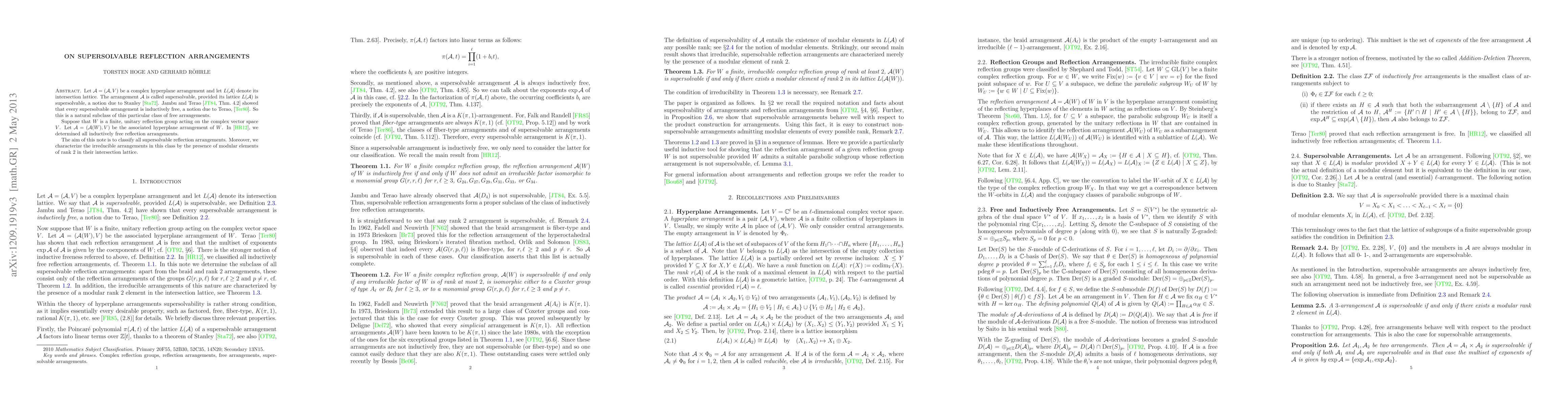 Let A = (A,V) be a complex hyperplane arrangement and let L(A) denote its intersection lattice. The arrangement A is called supersolvable, provided its lattice L(A) is supersolvable, a notion due to Stanley. Jambu and Terao showed that every supersolvable arrangement is inductively free, a notion due to Terao. So this is a natural subclass of this particular class of free arrangements. Suppose that W is a finite, unitary reflection group acting on the complex vector space V. Let A = (A(W), V) be the associated hyperplane arrangement of W. In a recent paper, we determined all inductively free reflection arrangements. The aim of this note is to classify all supersolvable reflection arrangements. Moreover, we characterize the irreducible arrangements in this class by the presence of modular elements of rank 2 in their intersection lattice.