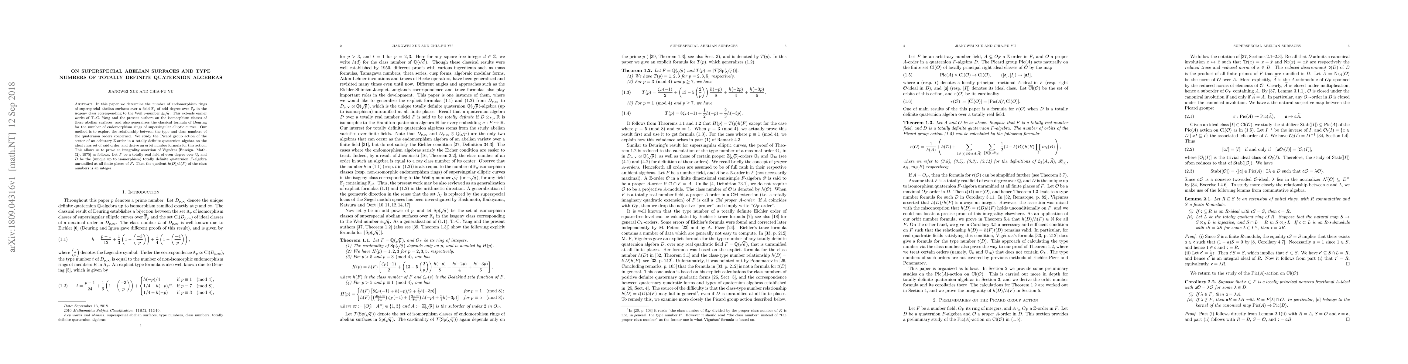 In this paper we determine the number of endomorphism rings of superspecial abelian surfaces over a field $\mathbb{F}_q$ of odd degree over $\mathbb{F}_p$ in the isogeny class corresponding to the Weil $q$-number $\pm\sqrt{q}$. This extends earlier works of T.-C. Yang and the present authors on the isomorphism classes of these abelian surfaces, and also generalizes the classical formula of Deuring for the number of endomorphism rings of supersingular elliptic curves. Our method is to explore the relationship between the type and class numbers of the quaternion orders concerned. We study the Picard group action of the center of an arbitrary $\mathbb{Z}$-order in a totally definite quaternion algebra on the ideal class set of said order, and derive an orbit number formula for this action. This allows us to prove an integrality assertion of Vign\'eras [Enseign. Math. (2), 1975] as follows. Let $F$ be a totally real field of even degree over $\mathbb{Q}$, and $D$ be the (unique up to isomorphism) totally definite quaternion $F$-algebra unramified at all finite places of $F$. Then the quotient $h(D)/h(F)$ of the class numbers is an integer.