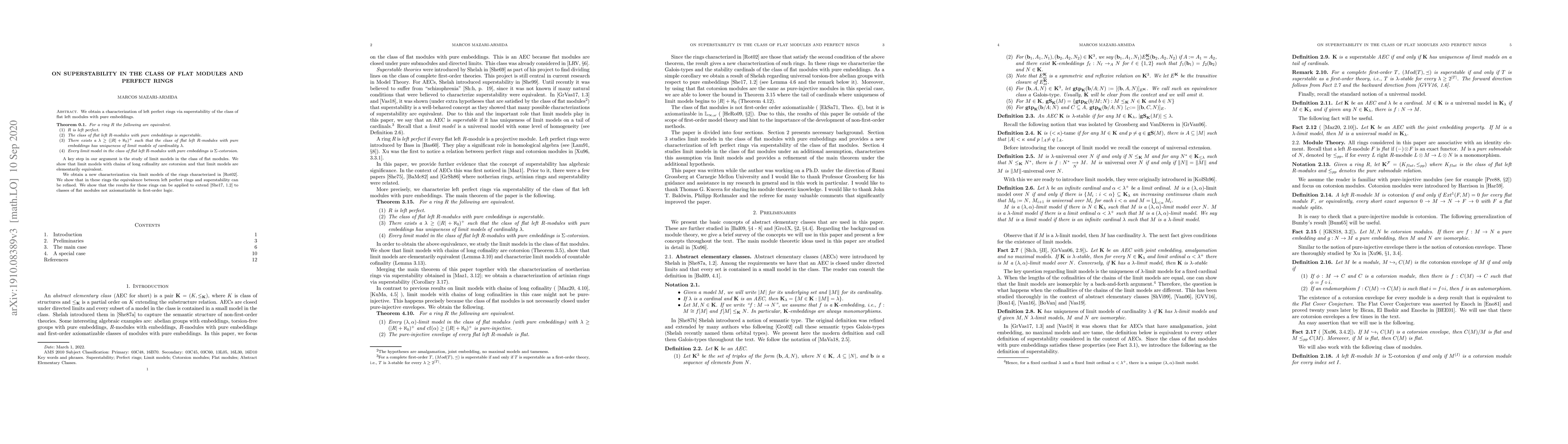 This paper characterizes left perfect rings through the superstability of the class of flat left modules with pure embeddings, proving that such rings are equivalent to the superstability of this module class and the existence of specific limit model properties. The study of limit models is pivotal, showing they are cotorsion and elementarily equivalent.