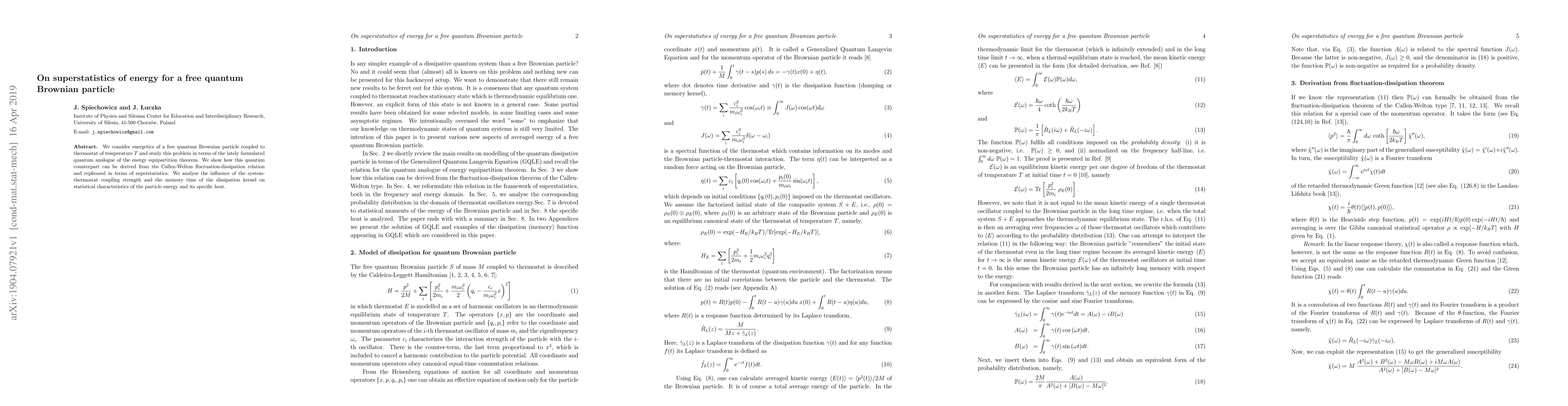 We consider energetics of a free quantum Brownian particle coupled to thermostat of temperature $T$ and study this problem in terms of the lately formulated quantum analogue of the energy equipartition theorem. We show how this quantum counterpart can be derived from the Callen-Welton fluctuation-dissipation relation and rephrased in terms of superstatistics. We analyse the influence of the system-thermostat coupling strength and the memory time of the dissipation kernel on statistical characteristics of the particle energy and its specific heat.