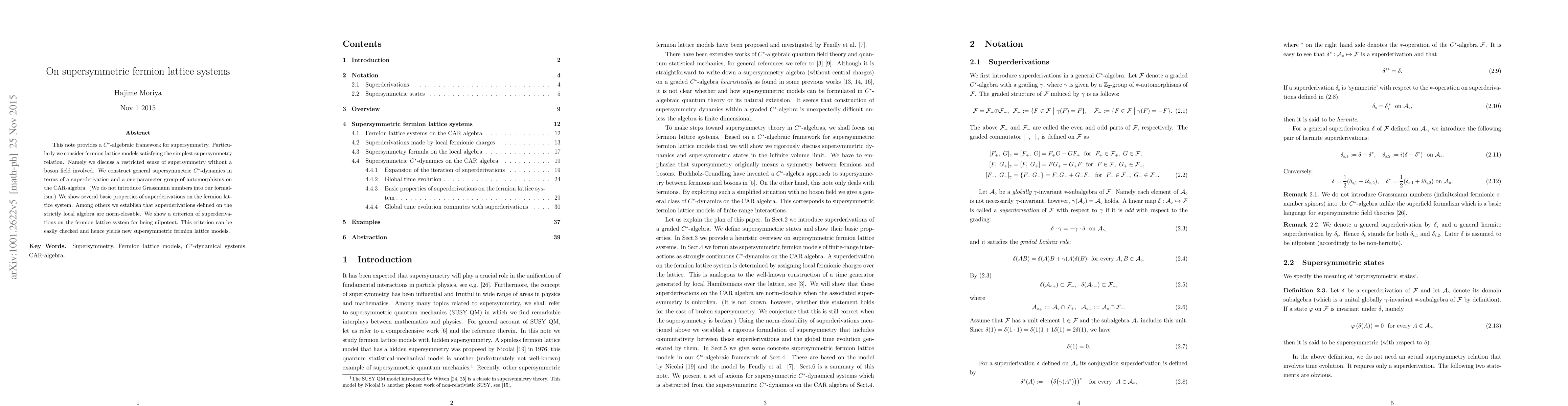 This paper develops a rigorous framework for supersymmetric fermion lattice systems, establishing properties of superderivations on the system and providing a criterion for generating supersymmetric dynamics.