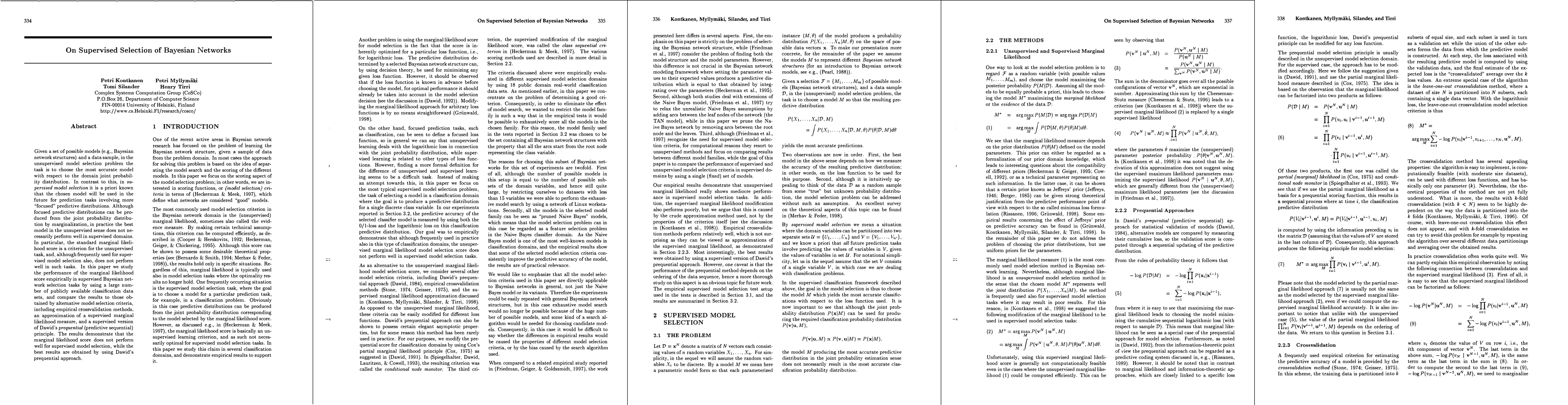 A research paper compares marginal likelihood score with Dawid's prequential approach in supervised Bayesian network selection tasks, finding that the latter outperforms the former.