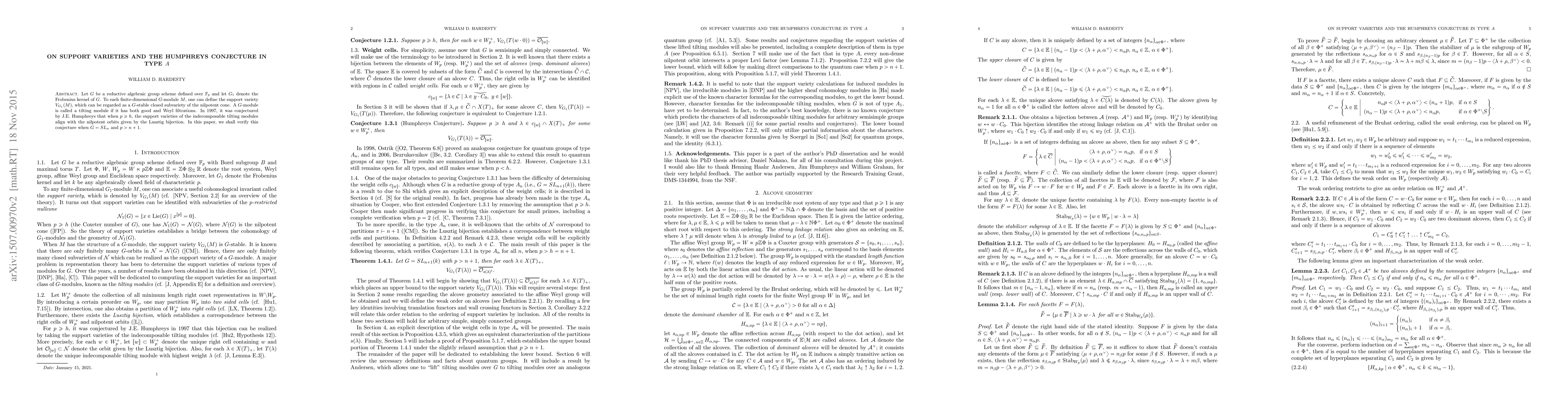 Let $G$ be a reductive algebraic group scheme defined over $\mathbb{F}_p$ and let $G_1$ denote the Frobenius kernel of $G$. To each finite-dimensional $G$-module $M$, one can define the support variety $V_{G_1}(M)$, which can be regarded as a $G$-stable closed subvariety of the nilpotent cone. A $G$-module is called a tilting module if it has both good and Weyl filtrations. In 1997, it was conjectured by J.E. Humphreys that when $p\geq h$, the support varieties of the indecomposable tilting modules coincide with the nilpotent orbits given by the Lusztig bijection. In this paper, we shall verify this conjecture when $G=SL_n$ and $p > n+1$.