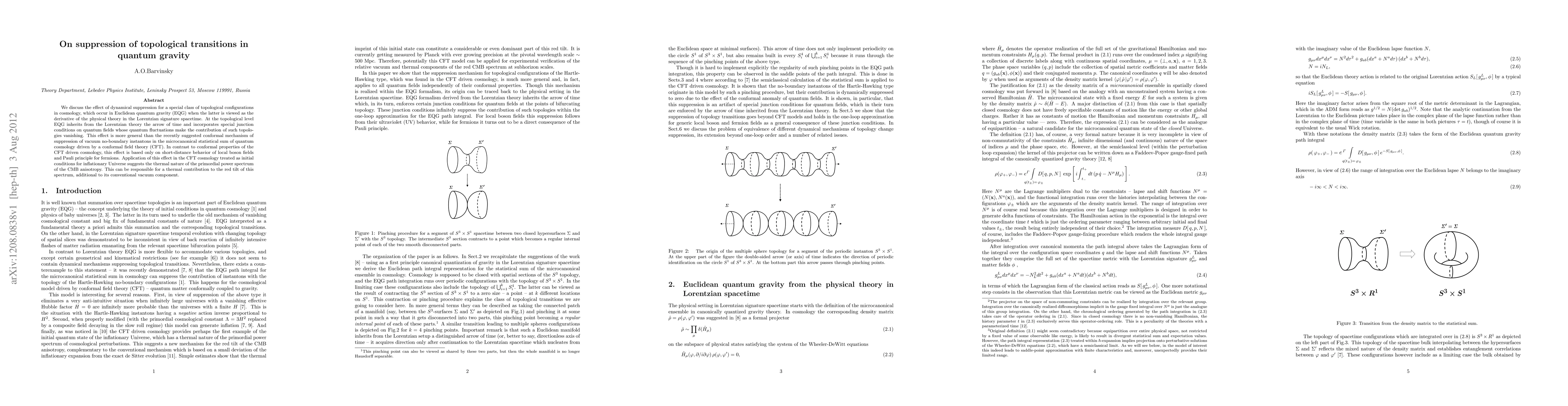 We discuss the effect of dynamical suppression for a special class of topological configurations in cosmology, which occur in Euclidean quantum gravity (EQG) when the latter is viewed as the derivative of the physical theory in the Lorentzian signature spacetime. At the topological level EQG inherits from the Lorentzian theory the arrow of time and incorporates special junction conditions on quantum fields whose quantum fluctuations make the contribution of such topologies vanishing. This effect is more general than the recently suggested conformal mechanism of suppression of vacuum no-boundary instantons in the microcanonical statistical sum of quantum cosmology driven by a conformal field theory (CFT). In contrast to conformal properties of the CFT driven cosmology, this effect is based only on short-distance behavior of local boson fields and Pauli principle for fermions. Application of this effect in the CFT cosmology treated as initial conditions for inflationary Universe suggests the thermal nature of the primordial power spectrum of the CMB anisotropy. This can be responsible for a thermal contribution to the red tilt of this spectrum, additional to its conventional vacuum component.