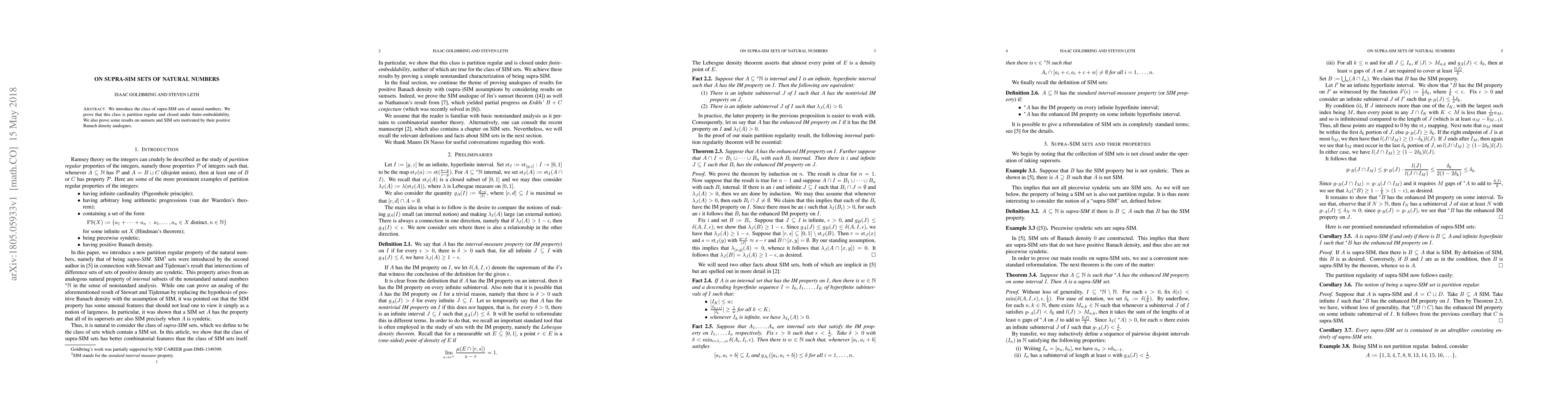 Summary: This paper defines supra-SIM sets of natural numbers, proving their partition regularity and closure under finite-embeddability. It also explores properties of sumsets and SIM sets with a focus on their positive Banach density analogues.
