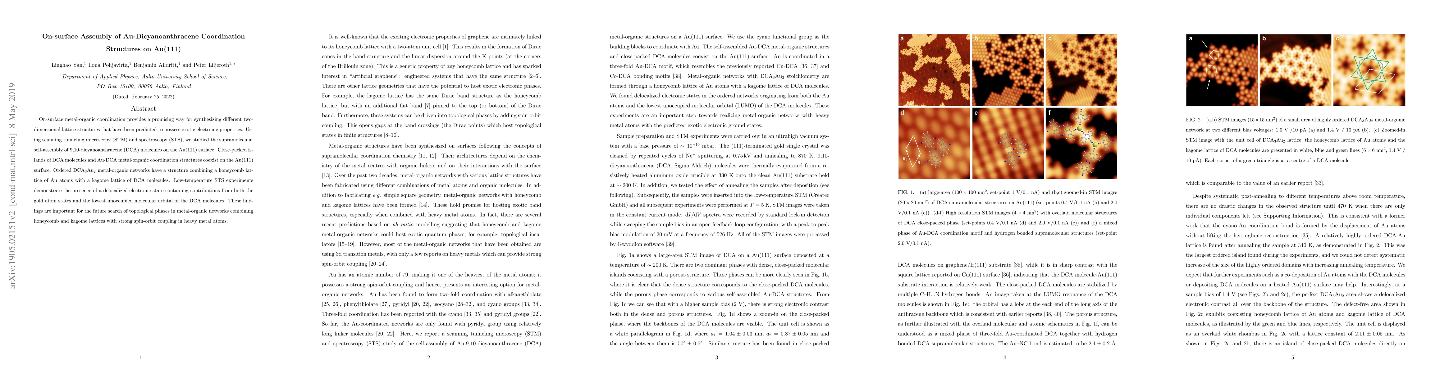 This paper investigates the on-surface assembly of Au-dicyanoanthracene coordination structures on Au(111) using STM and STS, revealing ordered DCA$_{3}$Au$_{2}$ networks with unique electronic properties, important for exploring topological phases.