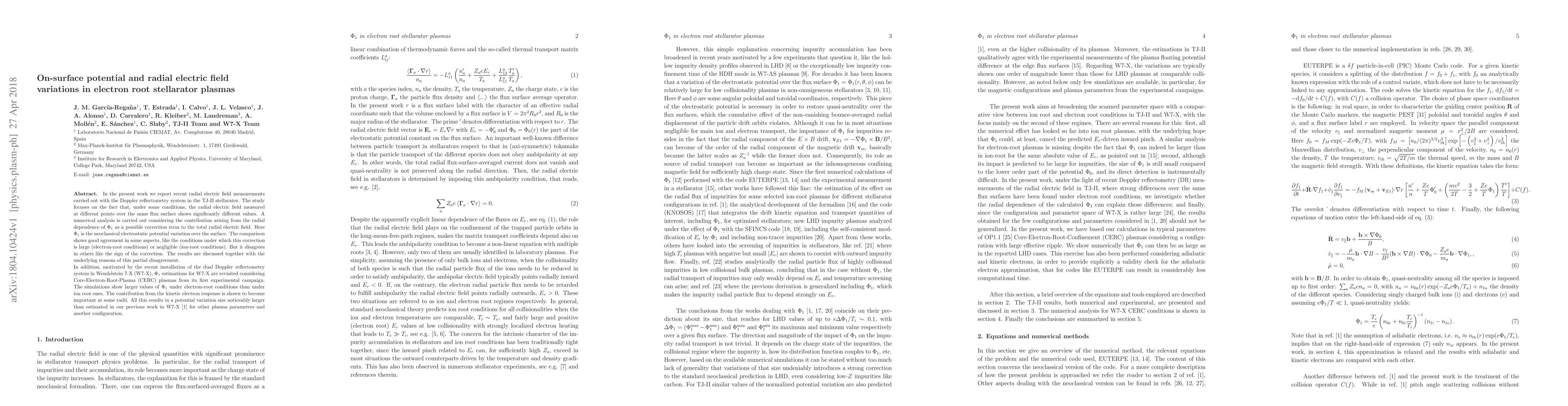 In the present work we report recent radial electric field measurements carried out with the Doppler reflectometry system in the TJ-II stellarator. The study focuses on the fact that, under some conditions, the radial electric field measured at different points over the same flux surface shows significantly different values. A numerical analysis is carried out considering the contribution arising from the radial dependence of $\Phi_1$ as a possible correction term to the total radial electric field. Here $\Phi_1$ is the neoclassical electrostatic potential variation over the surface. The comparison shows good agreement in some aspects, like the conditions under which this correction is large (electron-root conditions) or negligible (ion-root conditions). But it disagrees in others like the sign of the correction. The results are discussed together with the underlying reasons of this partial disagreement. In addition, motivated by the recent installation of the dual Doppler reflectometry system in Wendelstein 7-X (W7-X), $\Phi_1$ estimations for W7-X are revisited considering Core-Electron-Root-Plasma (CERC) plasmas from its first experimental campaign. The simulations show larger values of $\Phi_1$ under electron-root conditions than under ion root ones. The contribution from the kinetic electron response is shown to become important at some radii. All this results in a potential variation size noticeably larger than estimated in our previous work in W7-X \cite{Regana_nf_57_056004_2017} for other plasma parameters and another configuration.
