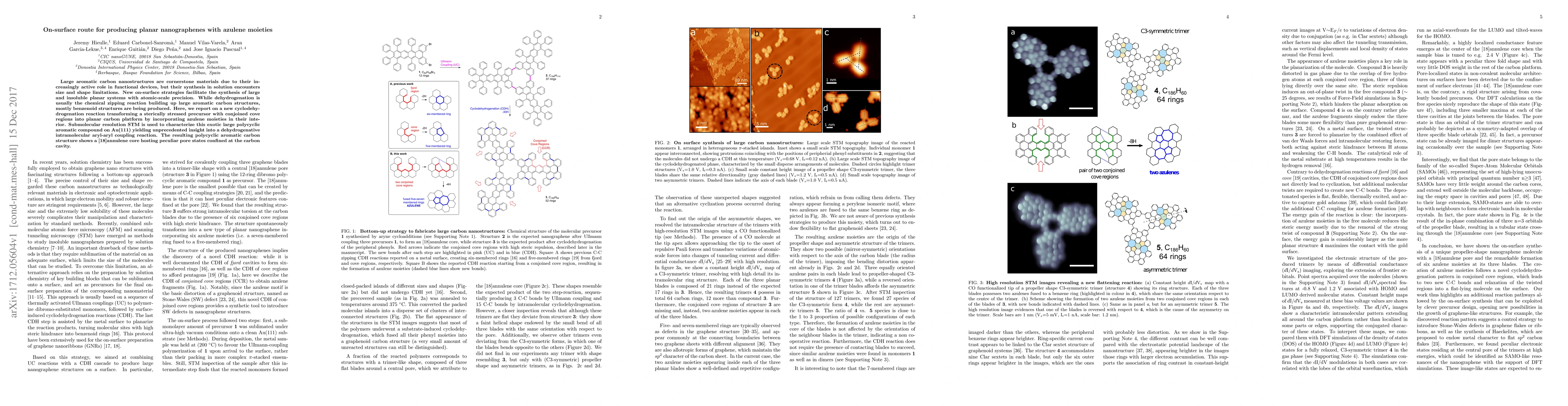 This paper reports a novel on-surface synthesis method for creating large planar nanographenes incorporating azulene moieties, overcoming traditional size and shape limitations in solution synthesis. The study utilizes submolecular resolution STM to characterize the resulting polycyclic aromatic compound on Au(111), revealing unique pore states confined within its [18]annulene core.
