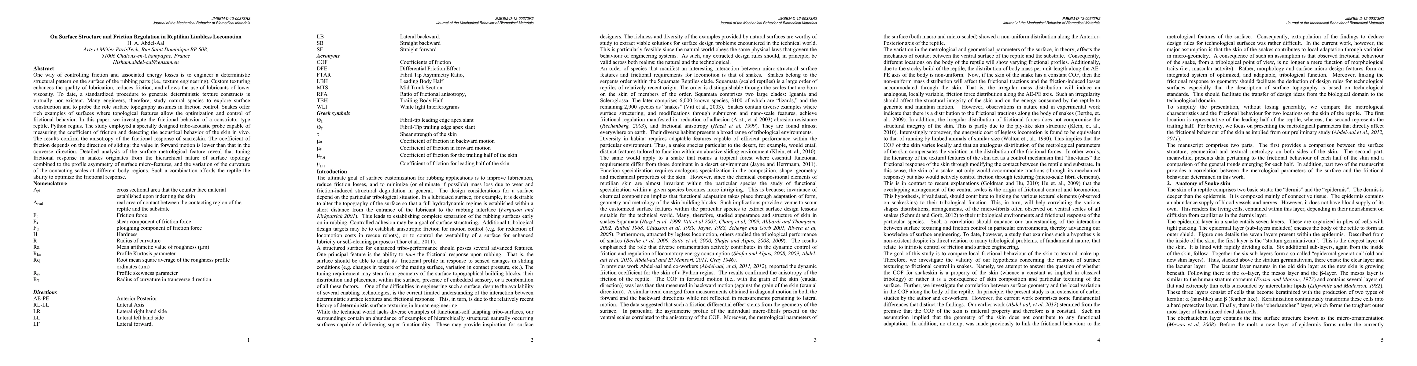 One way of controlling friction and associated energy losses is to engineer a deterministic structural pattern on the surface of the rubbing parts (i.e., texture engineering). Custom texturing enhances the quality of lubrication, reduces friction, and allows the use of lubricants of lower viscosity. To date, a standardized procedure to generate deterministic texture constructs is virtually non-existent. Many engineers, therefore, study natural species to explore surface construction and to probe the role surface topography assumes in friction control. Snakes offer rich examples of surfaces where topological features allow the optimization and control of frictional behavior. In this paper, we investigate the frictional behavior of a constrictor type reptile, Python regius. The study employed a specially designed tribo-acoustic probe capable of measuring the coefficient of friction and detecting the acoustical behavior of the skin in vivo. The results confirm the anisotropy of the frictional response of snakeskin. The coefficient of friction depends on the direction of sliding: the value in forward motion is lower than that in the converse direction. Detailed analysis of the surface metrological feature reveal that tuning frictional response in snakes originates from the hierarchical nature of surface topology combined to the profile asymmetry of surface micro-features, and the variation of the curvature of the contacting scales at different body regions. Such a combination affords the reptile the ability to optimize the frictional response.
