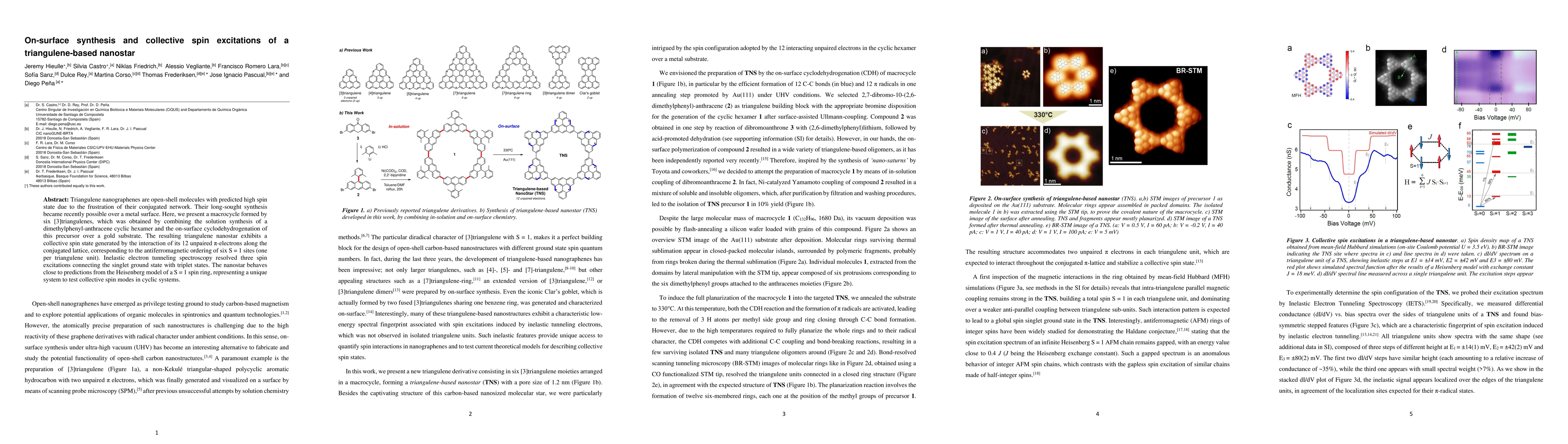 This paper reports the on-surface synthesis of a triangulene-based nanostar composed of six [3]triangulenes, revealing a collective spin state from the interaction of its 12 unpaired π-electrons. Inelastic electron tunneling spectroscopy identified three spin excitations, demonstrating the system's behavior near predictions from the Heisenberg model of a S = 1 spin ring.