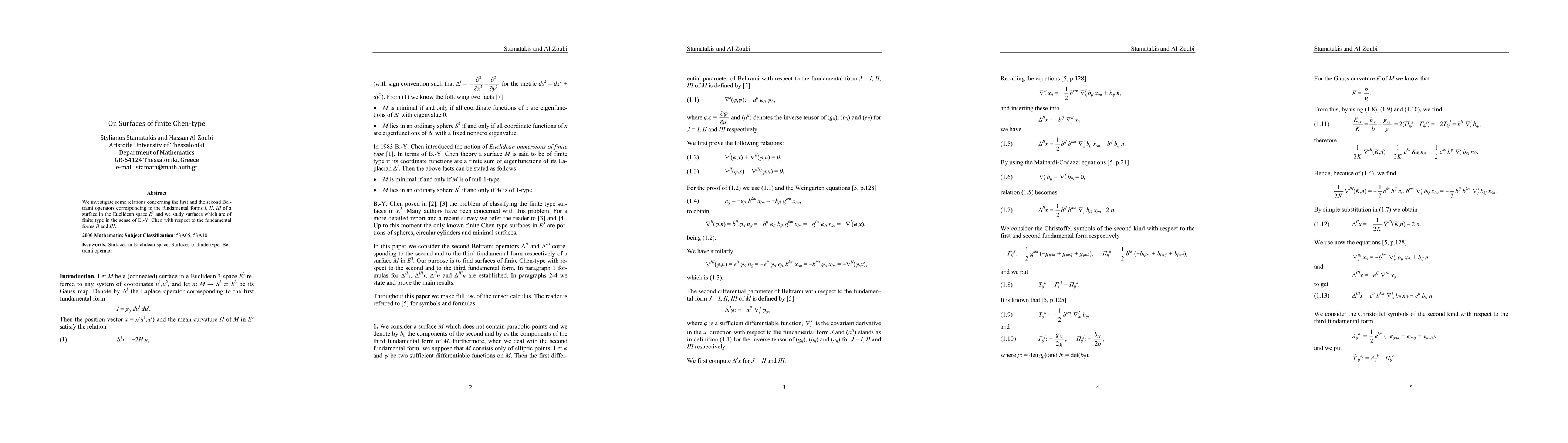 We investigate some relations concerning the first and the second Beltrami operators corresponding to the fundamental forms I, II, III of a surface in the three-dimensional Euclidean space and we study surfaces which are of finite type in the sense of B.-Y. Chen with respect to the fundamental forms II and III.