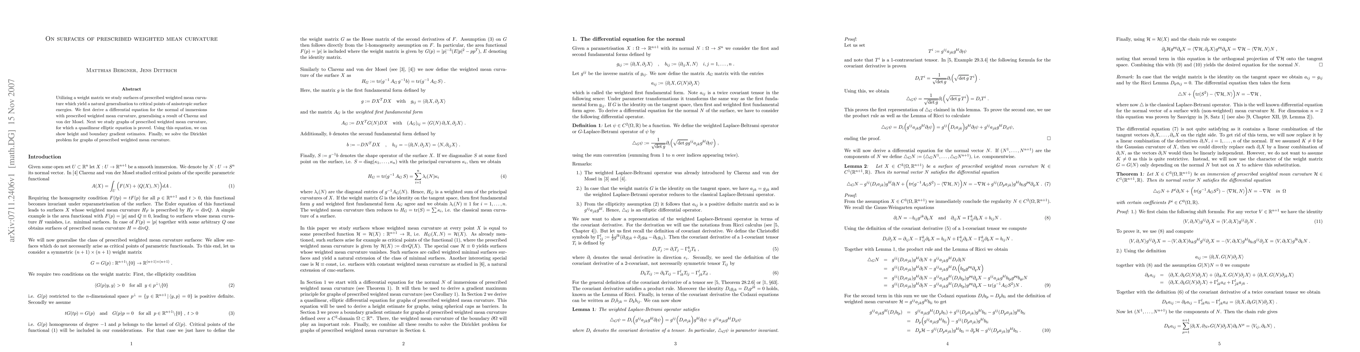 This paper generalizes the study of surfaces with prescribed weighted mean curvature, deriving a differential equation for their normals and establishing a quasilinear elliptic equation for graphs. It also provides height and boundary gradient estimates, ultimately solving the Dirichlet problem for such surfaces.