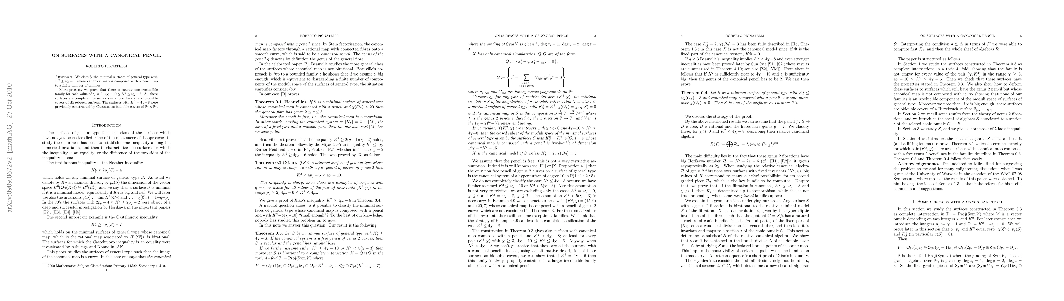 We classify the minimal surfaces of general type with $K^2 \leq 4\chi-8$ whose canonical map is composed with a pencil, up to a finite number of families. More precisely we prove that there is exactly one irreducible family for each value of $\chi \gg 0$, $4\chi-10 \leq K^2 \leq 4\chi-8$. All these surfaces are complete intersections in a toric $4-$fold and bidouble covers of Hirzebruch surfaces. The surfaces with $K^2=4\chi-8$ were previously constructed by Catanese as bidouble covers of $\PP^1 \times \PP^1$.