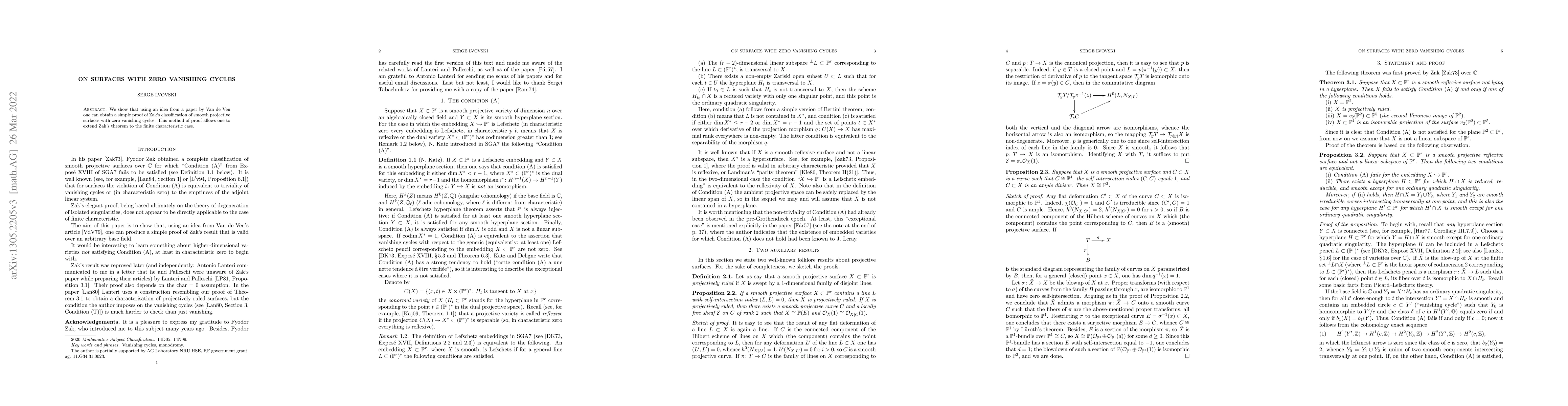 Summary: The paper presents a straightforward proof of Zak's classification of smooth projective surfaces with zero vanishing cycles, inspired by Van de Ven's work, and extends this classification to surfaces in finite characteristic.