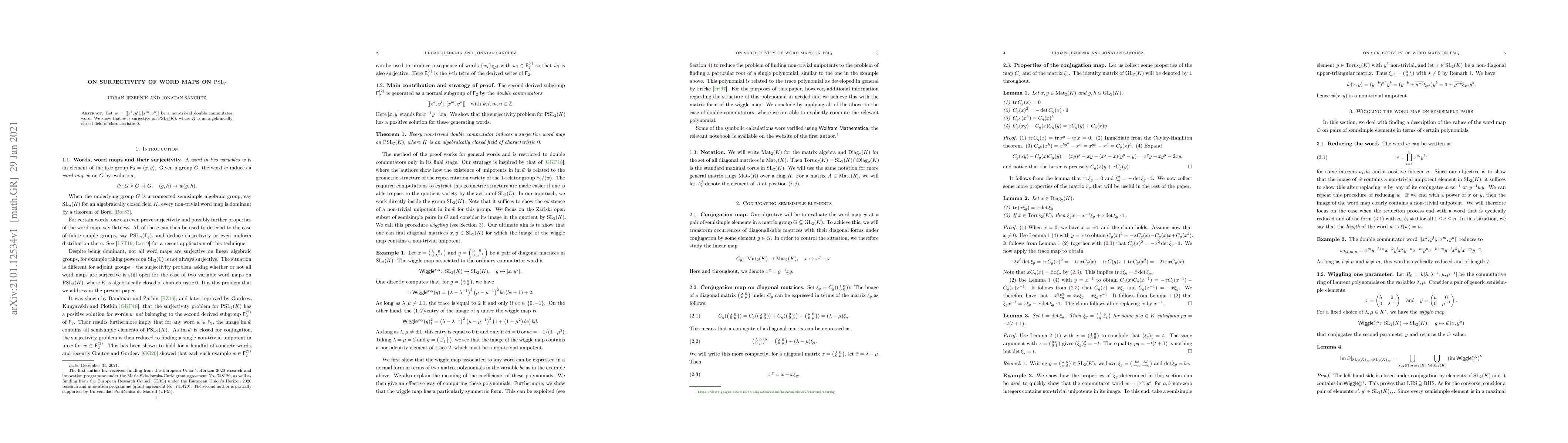 The paper uses algebraic methods to analyze the surjectivity of word maps on PSL_2, specifically focusing on non-trivial double commutator words. It introduces a wiggle map and utilizes properties of conjugation and matrix transformations to express the word map in terms of polynomials.