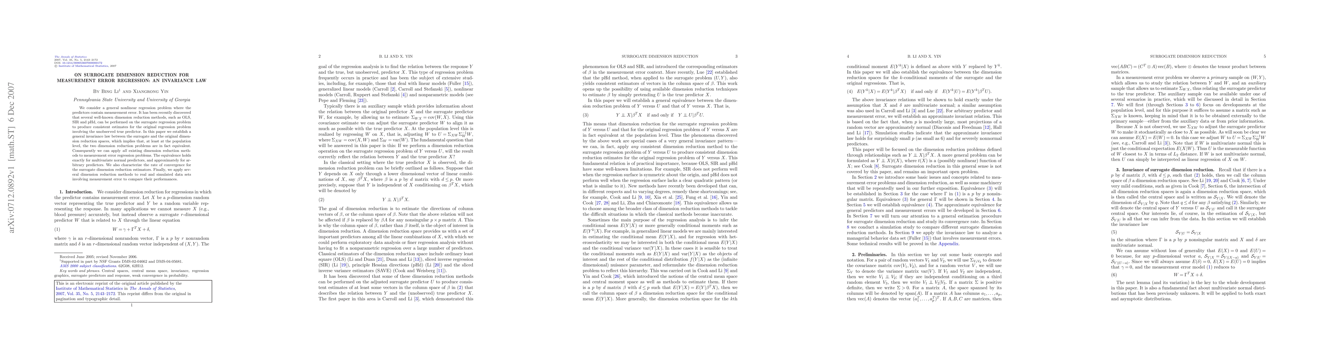 This paper establishes an invariance law showing that dimension reduction methods applied to surrogate regression problems yield consistent estimates for measurement error regression problems, implying equivalence between the surrogate and original dimension reduction spaces. The study characterizes the rate of convergence for these estimators and compares their performance on real and simulated data.