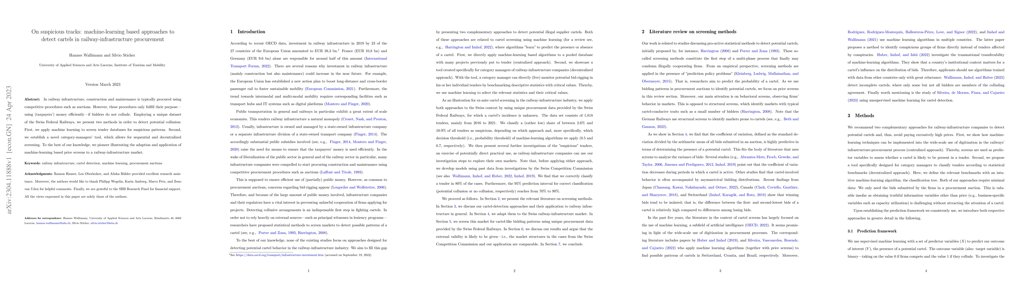 This paper introduces machine-learning methods to detect potential collusion in railway infrastructure procurement auctions using a Swiss Federal Railways dataset. It presents two approaches: a machine-learning-based screening tool for tender databases and a novel category-managers' tool for sequential, decentralized screening.