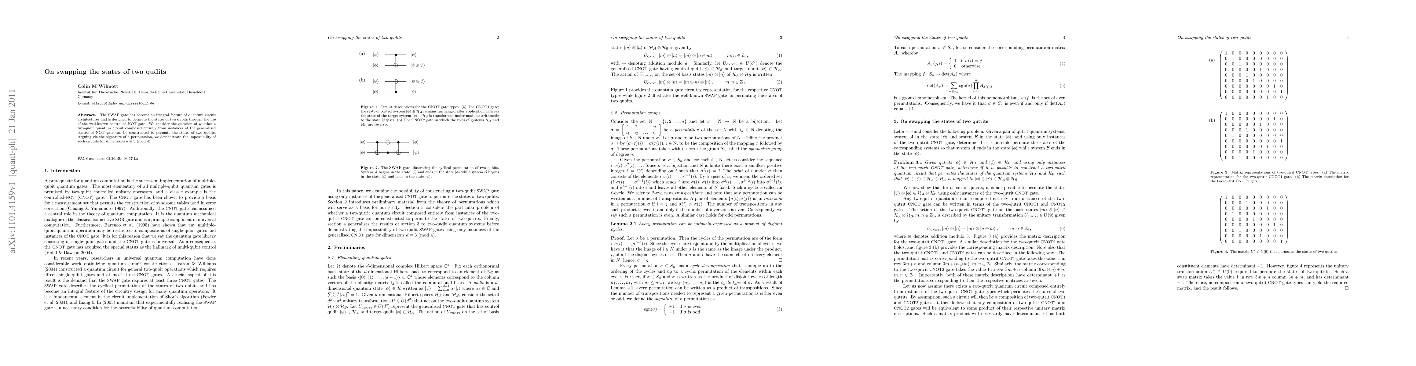The SWAP gate has become an integral feature of quantum circuit architectures and is designed to permute the states of two qubits through the use of the well-known controlled-NOT gate. We consider the question of whether a two-qudit quantum circuit composed entirely from instances of the generalised controlled-NOT gate can be constructed to permute the states of two qudits. Arguing via the signature of a permutation, we demonstrate the impossibility of such circuits for dimensions $d \equiv 3$ (mod 4).