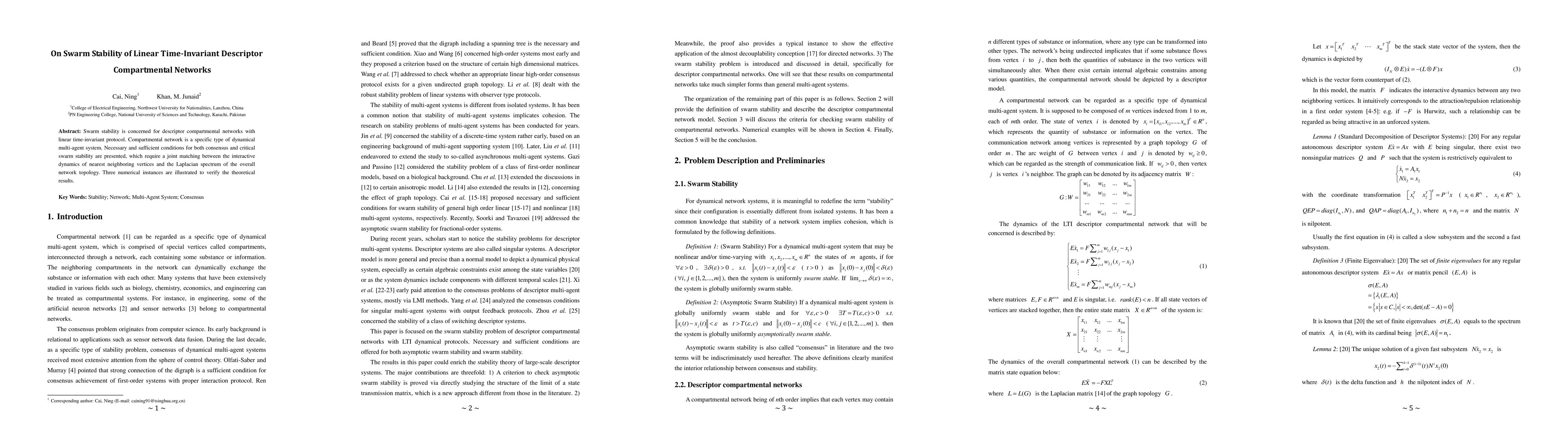 This paper presents necessary and sufficient conditions for consensus and critical swarm stability in linear time-invariant descriptor compartmental networks, emphasizing the interplay between local dynamics and network topology. The theoretical findings are validated through three numerical examples.