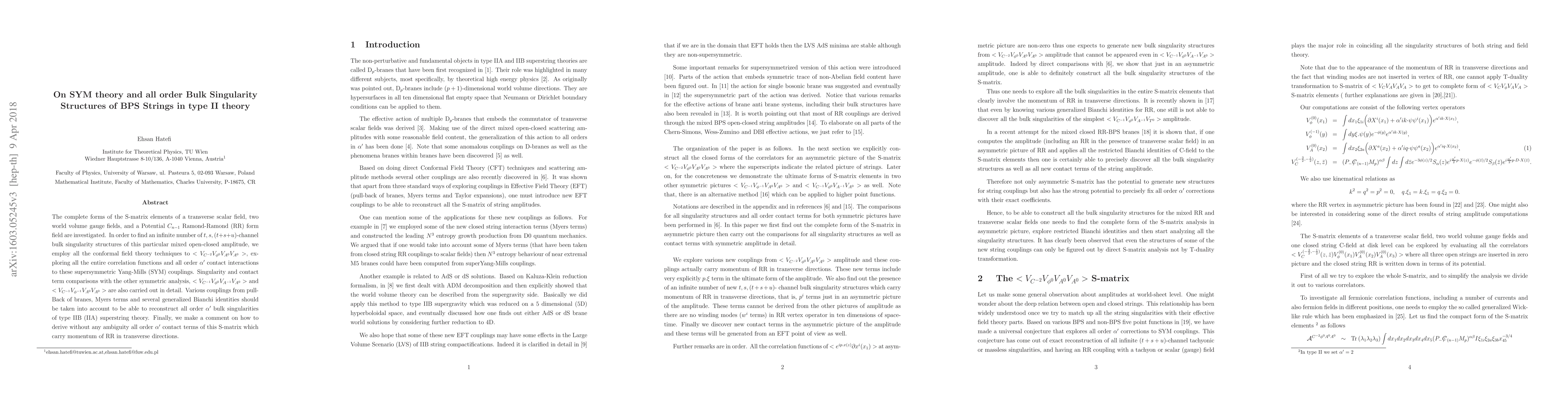 Researchers investigate the S-matrix elements of a transverse scalar field and gauge fields in type II theory to find infinite number of bulk singularity structures of BPS strings, utilizing conformal field theory techniques and exploring correlation functions and contact interactions.