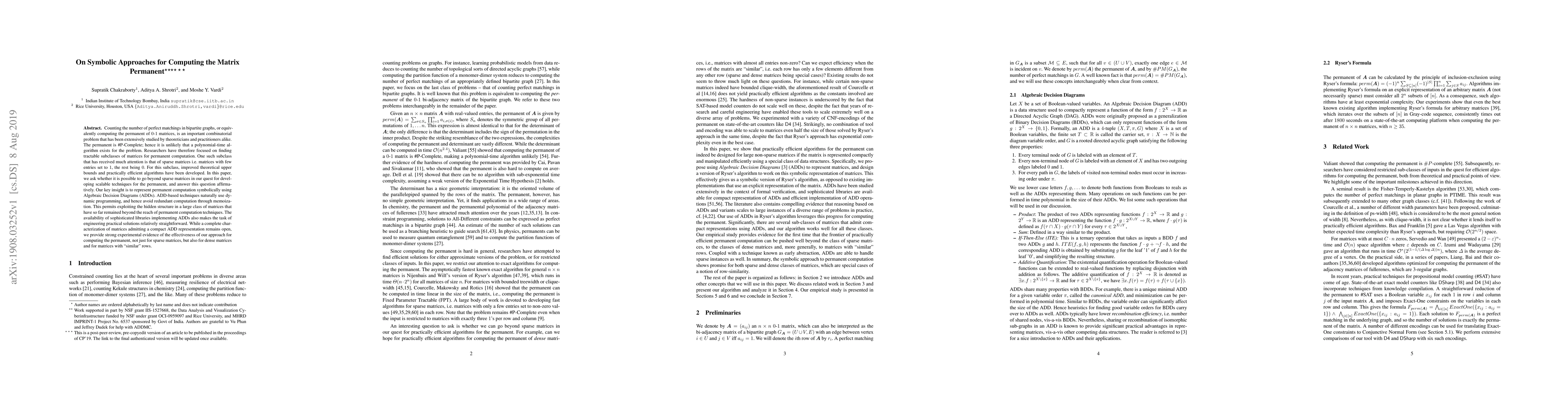 This paper explores the use of Algebraic Decision Diagrams (ADDs) to symbolically compute the matrix permanent, demonstrating improved efficiency over sparse matrices. The proposed ADD-based techniques leverage dynamic programming and memoization to exploit hidden structures in a broader class of matrices, providing practical solutions for dense matrices and matrices with similar rows.