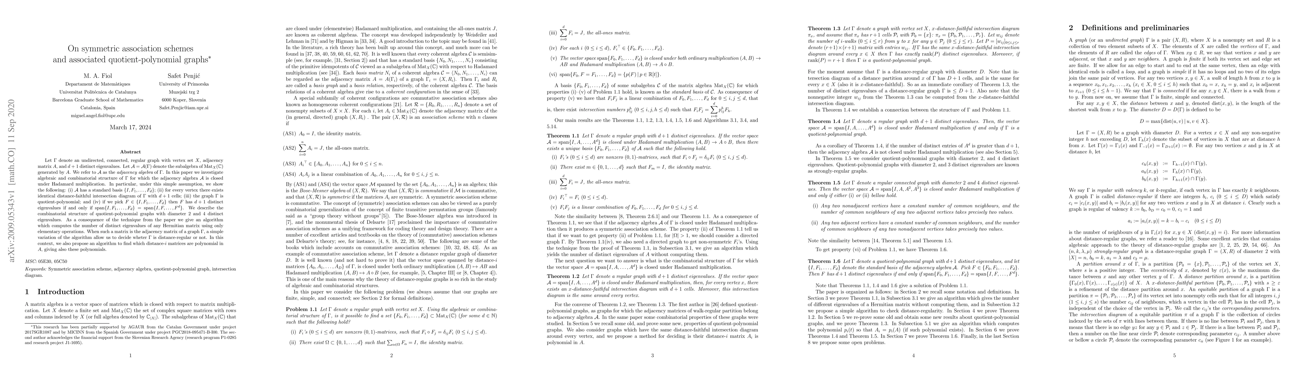 This research paper explores the algebraic and combinatorial structure of graphs with adjacency algebras closed under Hadamard multiplication, leading to key findings such as the existence of a standard basis, identical distance-faithful intersection diagrams, and quotient-polynomial properties. The study also presents algorithms to compute distinct eigenvalues of Hermitian matrices and to identify polynomial distance-i matrices, with applications in determining distance-regular graphs.