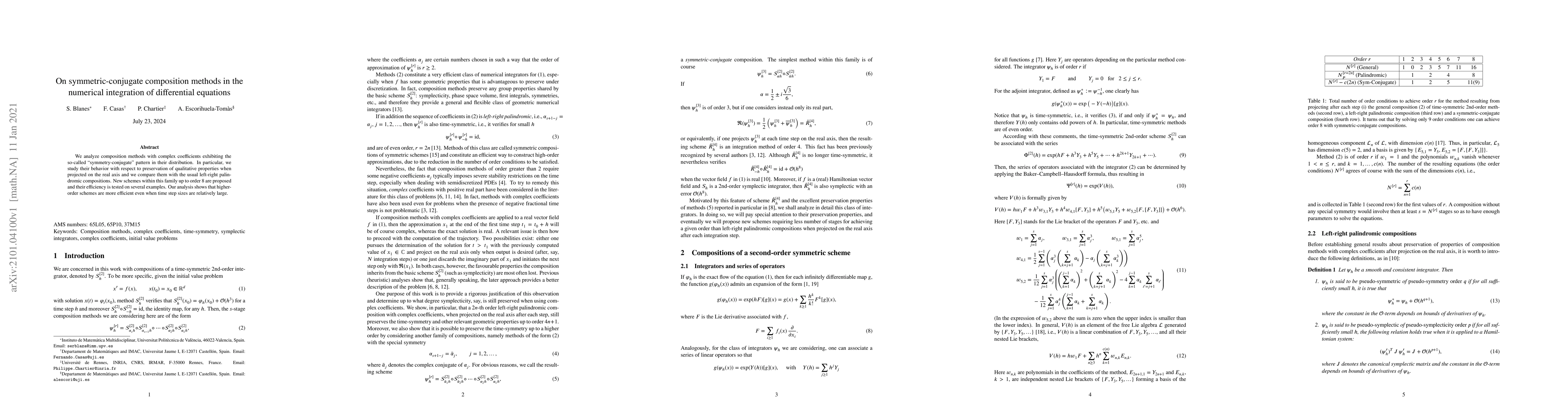We analyze composition methods with complex coefficients exhibiting the so-called ``symmetry-conjugate'' pattern in their distribution. In particular, we study their behavior with respect to preservation of qualitative properties when projected on the real axis and we compare them with the usual left-right palindromic compositions. New schemes within this family up to order 8 are proposed and their efficiency is tested on several examples. Our analysis shows that higher-order schemes are more efficient even when time step sizes are relatively large.