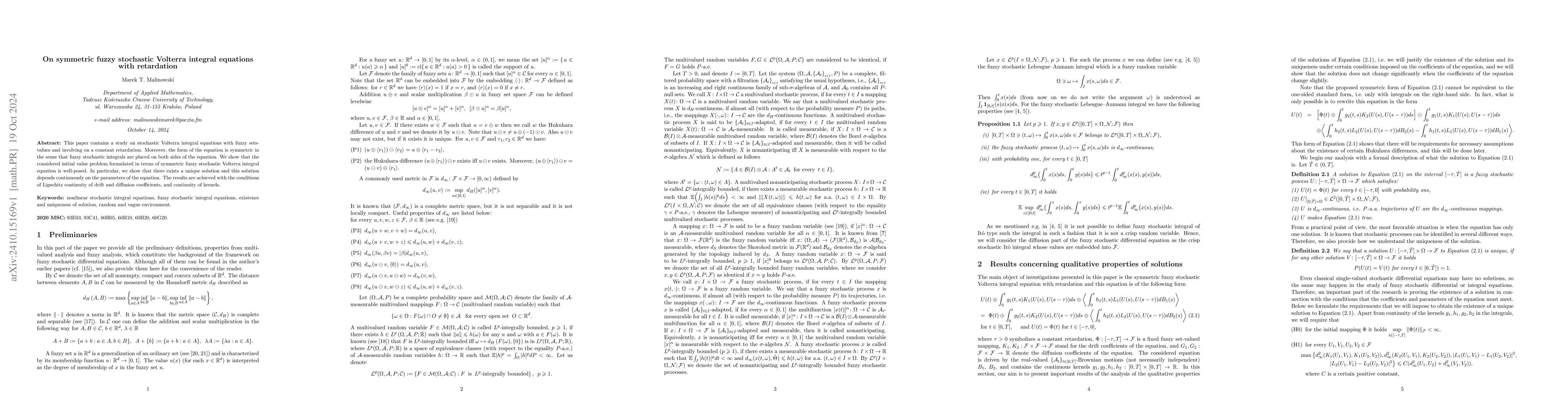 This paper contains a study on stochastic Volterra integral equations with fuzzy sets-values and involving on a constant retardation. Moreover, the form of the equation is symmetric in the sense that fuzzy stochastic integrals are placed on both sides of the equation. We show that the considered initial value problem formulated in terms of symmetric fuzzy stochastic Volterra integral equation is well-posed. In particular, we show that there exists a unique solution and this solution depends continuously on the parameters of the equation. The results are achieved with the conditions of Lipschitz continuity of drift and diffusion coefficients, and continuity of kernels