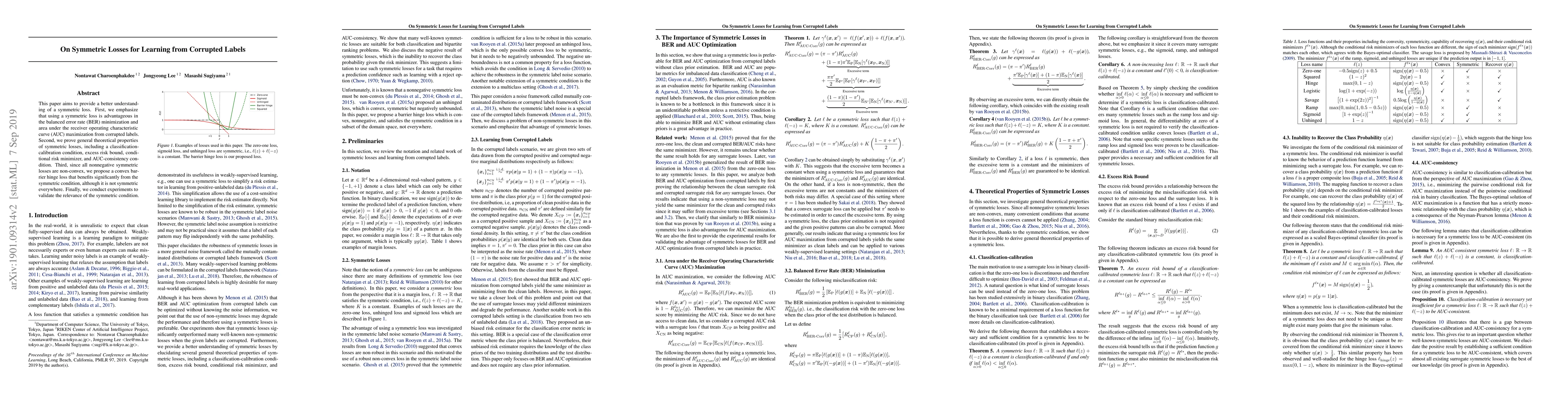 This paper aims to provide a better understanding of a symmetric loss. First, we emphasize that using a symmetric loss is advantageous in the balanced error rate (BER) minimization and area under the receiver operating characteristic curve (AUC) maximization from corrupted labels. Second, we prove general theoretical properties of symmetric losses, including a classification-calibration condition, excess risk bound, conditional risk minimizer, and AUC-consistency condition. Third, since all nonnegative symmetric losses are non-convex, we propose a convex barrier hinge loss that benefits significantly from the symmetric condition, although it is not symmetric everywhere. Finally, we conduct experiments to validate the relevance of the symmetric condition.