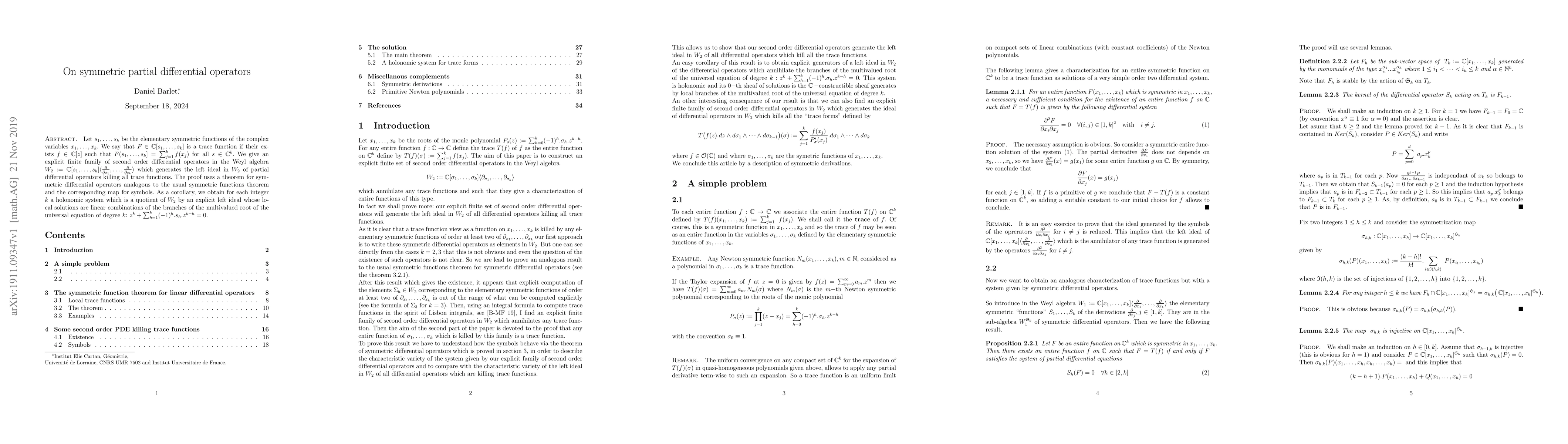 Let s 1 ,. .. , s k be the elementary symmetric functions of the complex variables x 1 ,. .. , x k. We say that F $\in$ C[s 1 ,. .. , s k ] is a trace function if their exists f $\in$ C[z] such that F (s 1 ,. .. , s k ] = k j=1 f (x j) for all s $\in$ C k. We give an explicit finite family of second order differential operators in the Weyl algebra W 2 := C[s 1 ,. .. , s k ] $\partial$ $\partial$s 1 ,. .. , $\partial$ $\partial$s k which generates the left ideal in W 2 of partial differential operators killing all trace functions. The proof uses a theorem for symmetric differential operators analogous to the usual symmetric functions theorem and the corresponding map for symbols. As a corollary, we obtain for each integer k a holonomic system which is a quotient of W 2 by an explicit left ideal whose local solutions are linear combinations of the branches of the multivalued root of the universal equation of degree k: z k + k h=1 (--1) h .s h .z k--h = 0.
