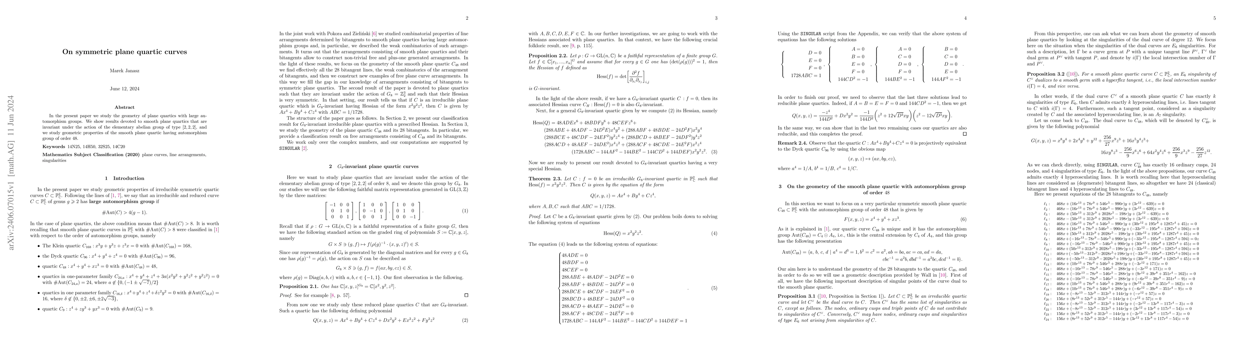 This paper investigates the geometric properties of symmetric plane quartic curves, focusing on those invariant under the elementary abelian group of type $[2,2,2]$ and those with an automorphism group of order $48$. Results include insights into their symmetries and geometric characteristics.