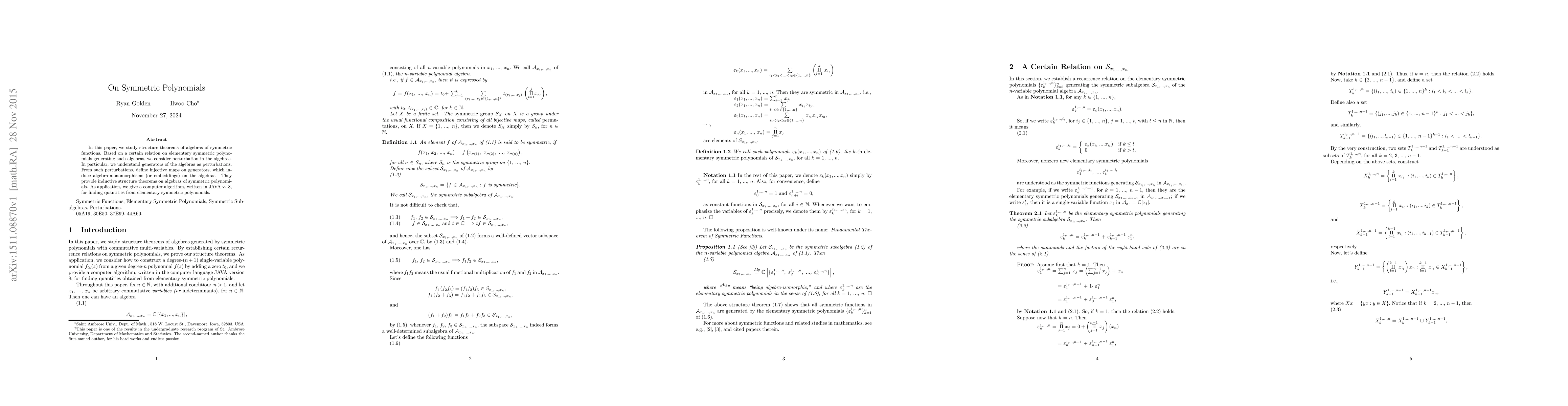 This paper explores structure theorems for algebras of symmetric functions through perturbation of elementary symmetric polynomials, defining injective maps that induce embeddings and providing inductive structure theorems. An accompanying Java algorithm is presented for computational determination of quantities from these polynomials.