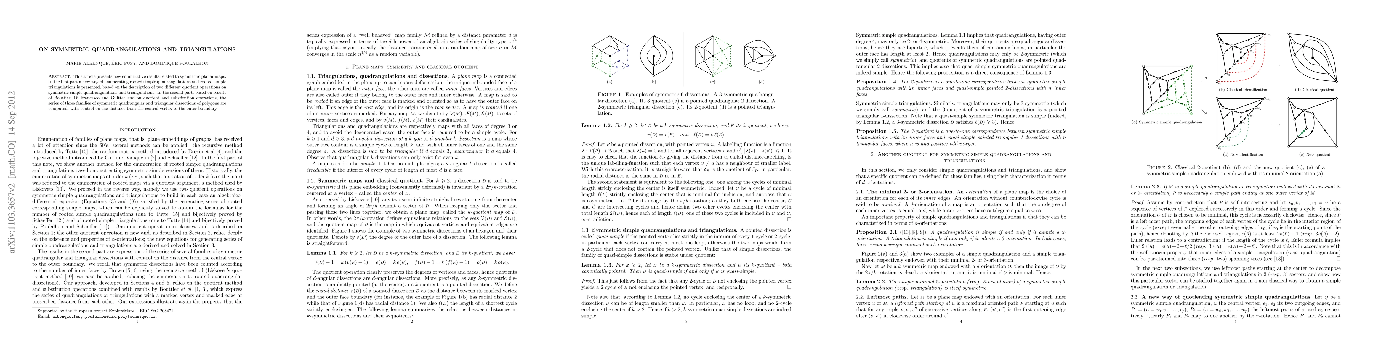 This paper introduces new enumeration methods for rooted simple quadrangulations and triangulations via quotient operations, and computes series for symmetric quadrangular and triangular dissections of polygons using substitution and quotient operations, with a focus on distances from the central vertex.